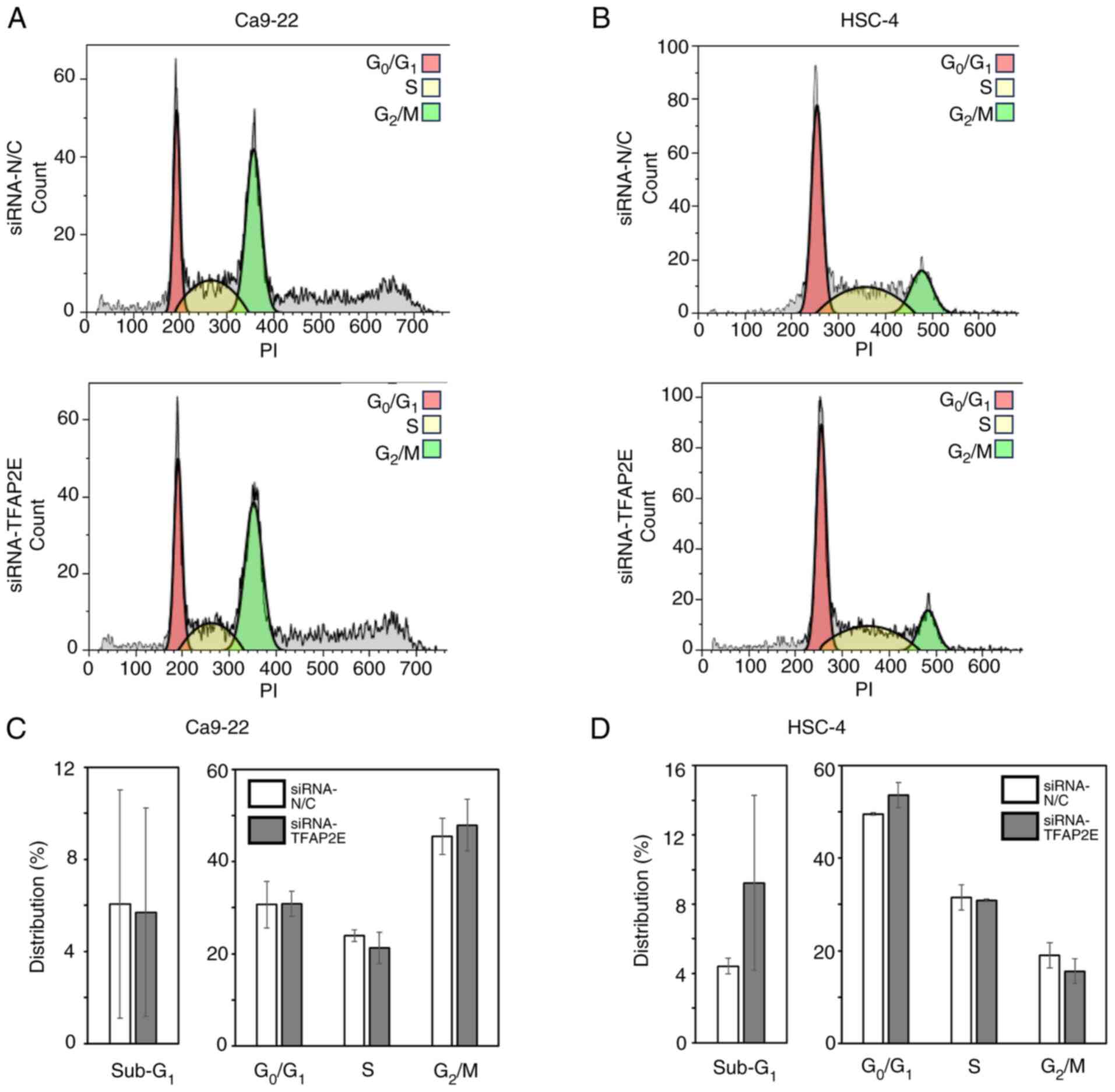 Ca9-22 and HSC-4 cells were seeded and cultured for 24 h before transfecting with 10 nM siRNA using Lipofectamine® 3000 (Invitrogen; Thermo Fisher Scientific, Inc.), according to the manufacturer's instructions at room temperature. Anti-TFAP2E siRNA (cat. no. s50548; Thermo Fisher Scientific, Inc.), a control siRNA (si-N/C; cat. no. 4390843; Thermo Fisher Scientific, Inc.) and anti-TP53 siRNA (cat. no. sc-29435; Santa Cruz Biotechnology, Inc.) were used in the present study.