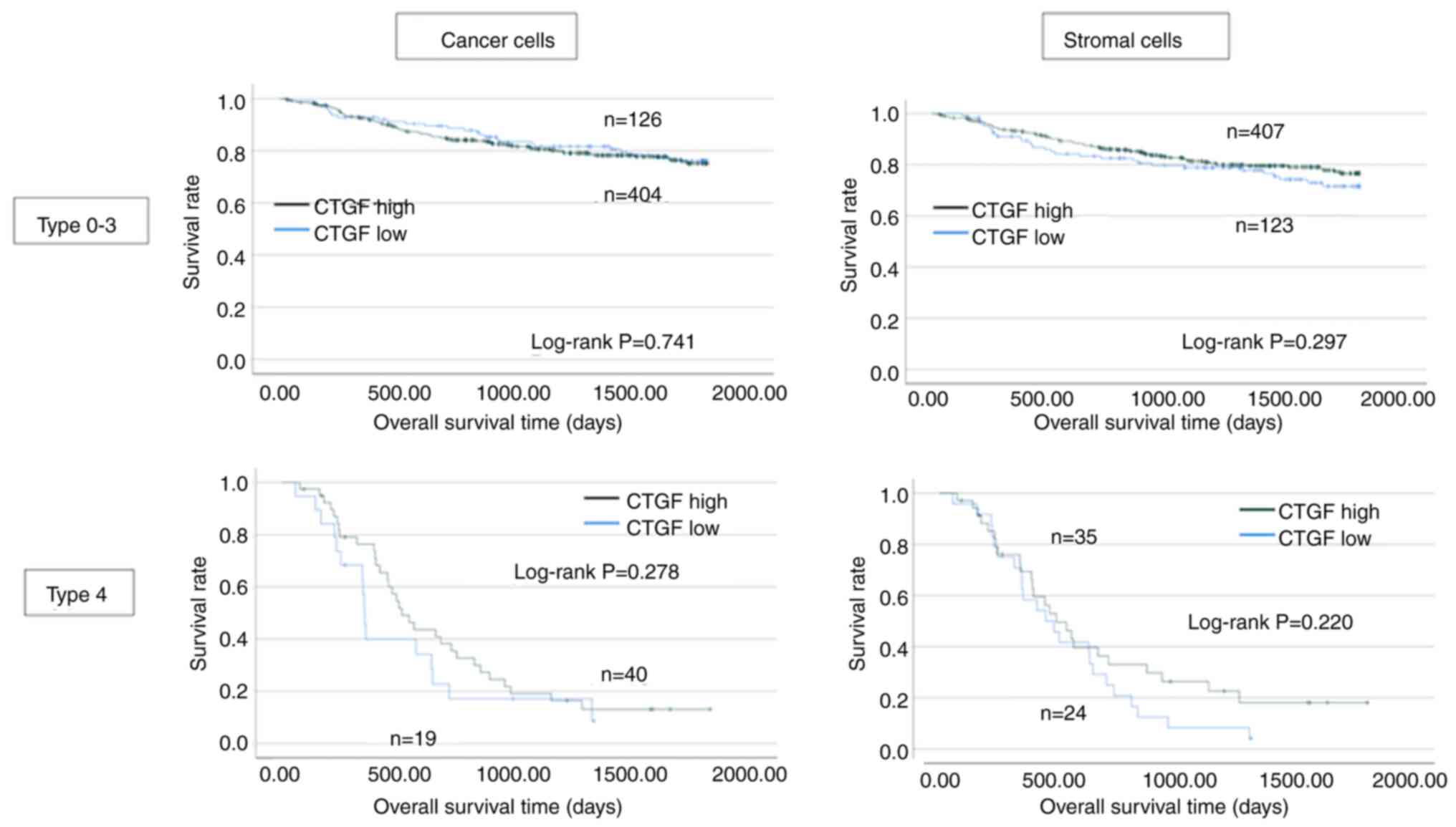 Fig. 5 shows the analyses for each macroscopic type. Among the scirrhous type GC, patients with CTGF-negative cases demonstrated worse survival in both cancer and stromal cell analyses although the difference was not significant.