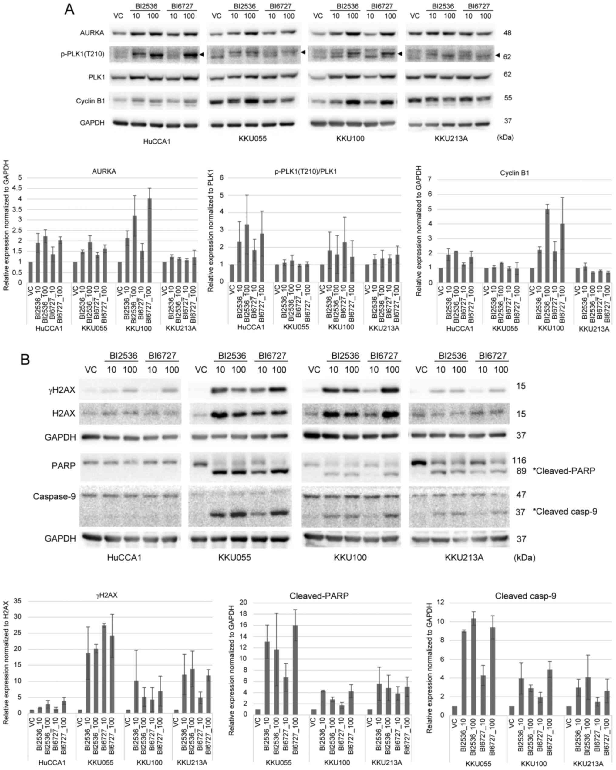 Additionally, the effect of PLK1 inhibition on the induction of DNA damage leading to cell death has been previously reported (45). To verify the possible mechanisms of PLK1 inhibitor-induced cell death, the levels of DNA strand breaks were assessed via the detection of phosphorylated histone H2AX at S139 (called γH2AX), as well as the detection of apoptotic markers, PARP and caspase-9 cleavage, following BI2536 and BI6727 treatment. The present study observed the upregulation of gH2AX across all four CCA cell lines, thus indicating an increase in DNA damage after PLK1 inhibition (Fig. 5B). Furthermore, both BI2536 and BI6727 caused PARP and caspase-9 cleavage in KKU055, KKU100 and KKU213A cell lines. These results are in line with the percentages of total apoptotic cells shown in Fig. 4B, whereby HuCCA1 cells displayed a comparatively lower count of apoptotic cells in relation to the other cell lines. Similar trends were observed upon treatment with BI6727.