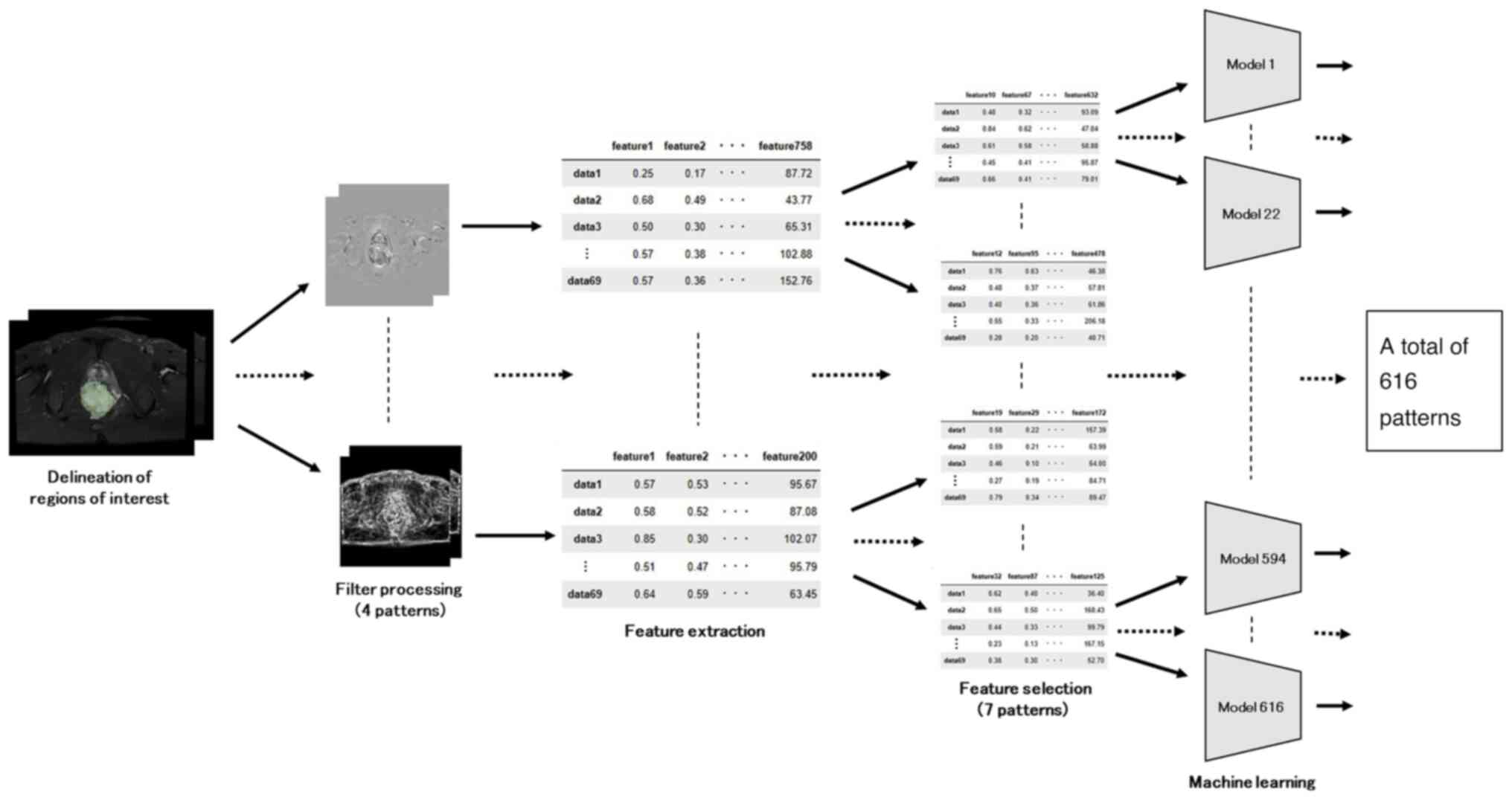 The radiomics process is visually presented in the flowchart shown in Fig. 2. Prediction accuracy was calculated for a total of 616 patterns, which is the sum of 4 patterns for the filtering process, 7 patterns for feature selection, and various models (6 different models and hyperparameters for a total of 22 patterns).