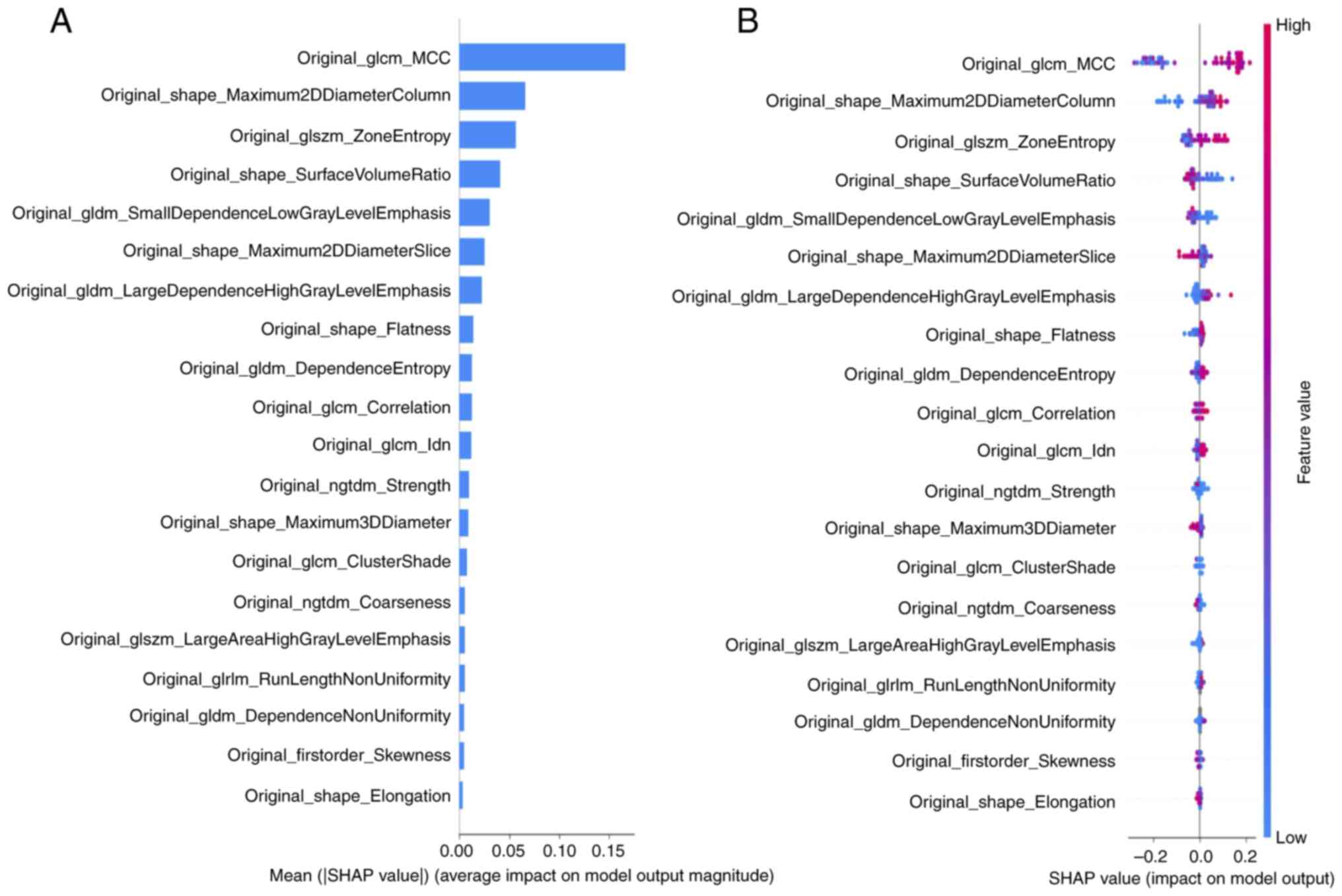 Wang Y, Lang J, Zuo JZ, Dong Y, Hu Z, Xu X, Zhang Y, Wang Q, Yang L, Wong STC, et al: The radiomic-clinical model using the SHAP method for assessing the treatment response of whole-brain radiotherapy: a multicentric study. Eur Radiol. 32:8737–8747. 2022. View Article : Google Scholar : PubMed/NCBI | |