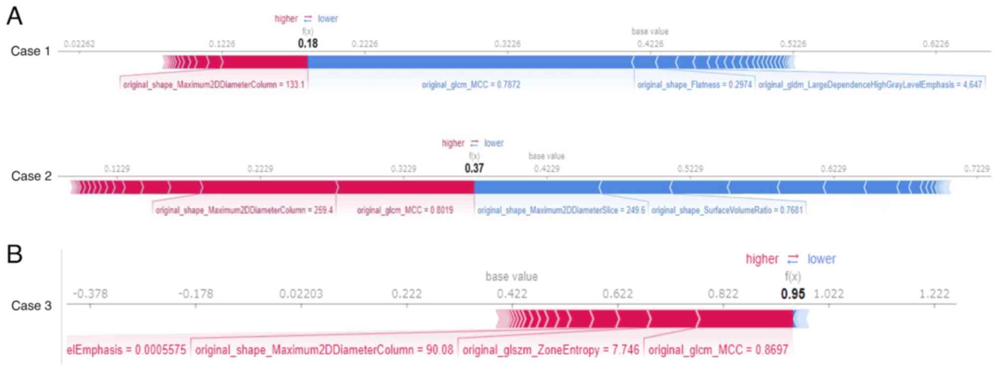 A force plot (Fig. 4) was generated for each individual data set to show which and the degree to which features influenced the model to reach its predictions. Features with positive SHAP values are represented in red, features with negative SHAP values are represented in blue, and the length of the bar indicates the magnitude of the SHAP value for each feature. Two patients (Fig. 4A) for whom cancer could not be correctly predicted and one patient (Fig. 4B) for whom cancer could be correctly predicted are shown for comparison. GLCM_MCC in Case 1 and SHAPE_Maximum 2D Diameter Column and SHAPE_Surface Area to Volume Ratio in Case 2 had negative SHAP values. The two patients for whom cancer could not be correctly predicted had stage 1 early-stage cancer (Case 1) and squamous cell carcinoma (Case 2). There were two patients with stage 1 cancer and two with squamous cell carcinoma in all cases.