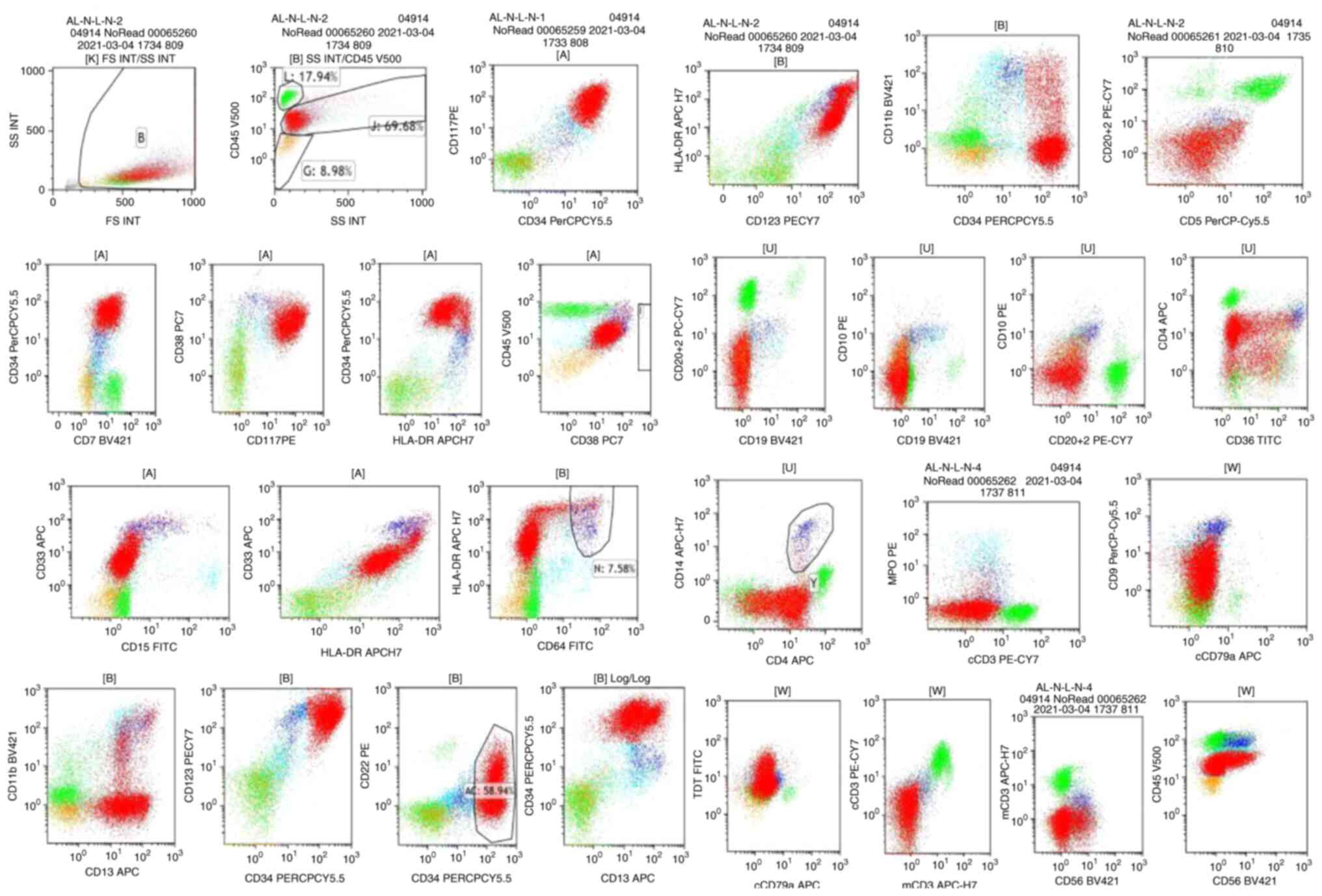 In March 2021, a 50-year-old female patient presented to another hospital (The Affiliated Hospital of Hebei University, Baoding, China) with progressive fatigue that had persisted for 1 week. At 3 months prior to admission, the patient had noted a 20-mm mass in the left breast; however, the patient refused to be hospitalized. A complete blood count indicated a white blood cell count of 22×109/l (normal range, 3.5–9.5×109/l), a hemoglobin concentration of 92 g/l (normal range, 115–150 g/l) and a platelet count of 42×109/l (normal range, 125–300×109/l). A large number of monoblastic cells, which accounted for 66% of bone marrow nucleated cells, were observed in a bone marrow smear analysis (Fig. 1). Immunophenotyping revealed that the blast cells were CD34+, HLA-DR+, CD123+, CD38+, CD117+, CD7+, CD11b+, CD13+ and CD33+, which appeared with myeloid blasts (Fig. 2). The patient harbored a complex karyotype (CK), as well as a monosomal karyotype (MK) {44,XX,t(4;16)(q11;p13),-15,-17,add(17)(p11),-19,-21,+mar1,+mar2[5]/44,idem del(5)(q31)[2]/46,XX[9]} (Fig. 3), without any molecular and next-generation sequencing abnormalities. Based on the World Health Organization 2016 criteria (15), the patient was diagnosed with AML (AML-not otherwise specified; poor-risk). There was a mass in the upper outer quadrant of the left breast of the patient and a palpable left axillary node was present. An ultrasound revealed a 39×32-mm mass (3 o'clock); however, the patient did not consent to a biopsy of the breast mass. These aforementioned results were provided by a relative of the patient.