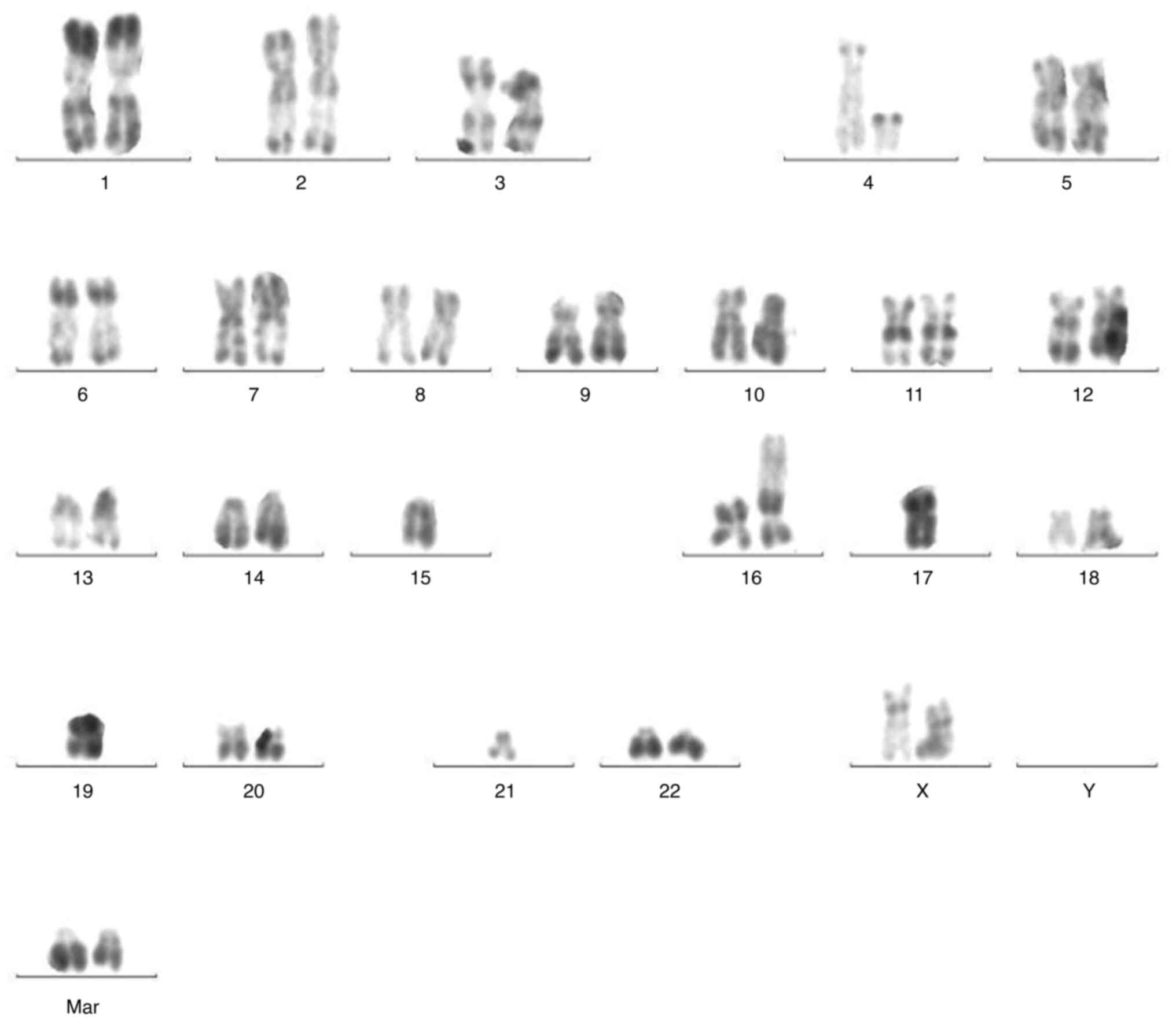 Wierzbowska A, Wawrzyniak E, Siemieniuk-Rys M, Kotkowska A, Pluta A, Golos A, Robak T, Szarawarska M, Jaskowiec A, Duszenko E, et al: Concomitance of monosomal karyotype with at least 5 chromosomal abnormalities is associated with dismal treatment outcome of AML patients with complex karyotype-retrospective analysis of Polish adult leukemia group (PALG). Leuk Lymphoma. 58:889–897. 2017. View Article : Google Scholar : PubMed/NCBI | |