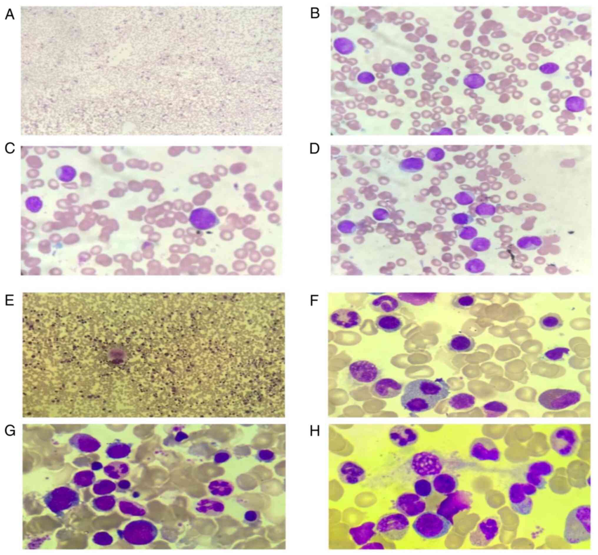 After obtaining informed consent, the patient began an adjuvant chemotherapy treatment regimen with pegylated liposomal doxorubicin at 40 mg (day 1, per 21 days for two cycles) and albumin-bound paclitaxel at 200 mg (days 1 and 8, per 21 days for two cycles) to treat mBC. The patient was also treated with standard AZA at 75 mg/m2 subcutaneously for 7 days, in combination with oral venetoclax for AML (based on a pharmacokinetic test, from a dose of 100–200 mg/day, the dosing of which must be adjusted in the setting of the concomitant administration of the CYP3A4 inhibitor, voriconazole (200 mg twice daily for 4 weeks). Tumor lysis syndrome was monitored during a 3–5-day dose ramp-up of venetoclax, and G-CSF was also administered (300 µg per day for 3 weeks) to reduce the risk of infections and other cytopenia-related adverse events with the venetoclax-based combinations. When the white blood cell and platelet counts of the patient were normal (white blood cell count, 5.6×109/l; platelet count, 218×109/l) a bone marrow aspiration was performed on day 28 (Fig. 4E-H). With the clearance of blasts (<5%), the response to AML treatment was defined as CR with incomplete hematological recovery (CRi). The treatment response to BC was defined as PR as the mass in the left breast was notably smaller (only 20×20 mm in size). Due to economic reasons, the patient refused an allogeneic hematopoietic stem cell transplantation (allo-HSCT); thus, the patient was then treated with another cycle of chemotherapy without dose modifications. However, the patient succumbed due to septic shock from neutropenia following the third cycle of chemotherapy.