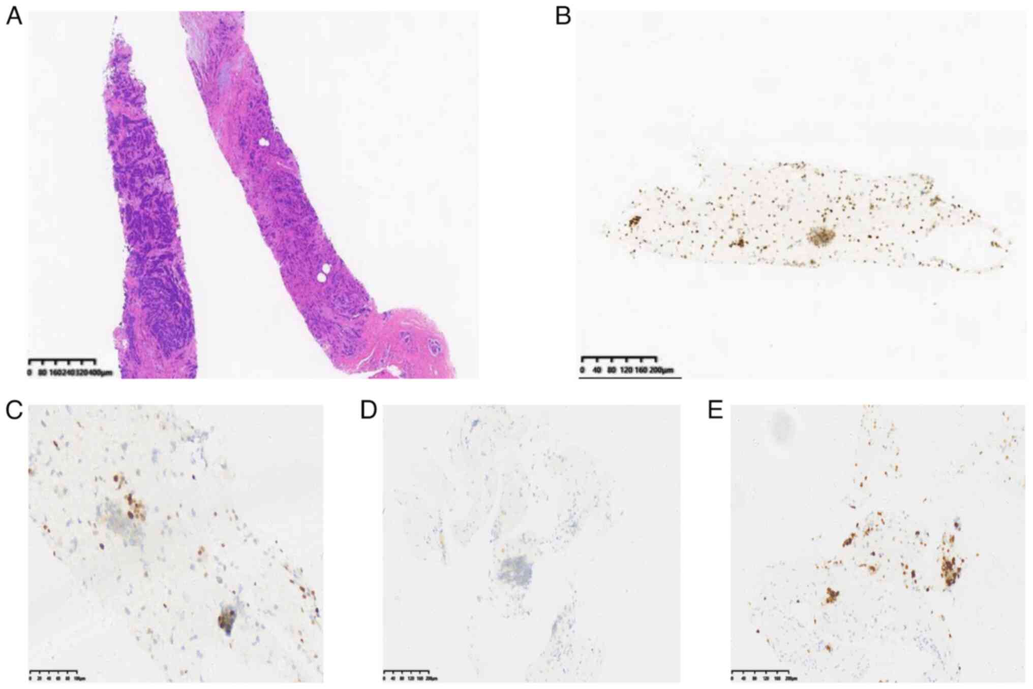 A subsequent peripheral blood cell count indicated a white blood cell count of 0.7×109/l, a hemoglobin concentration of 58 g/l and a platelet count of 53×109/l. To evaluate the effect of the previous cycle of combination chemotherapy, another bone marrow smear analysis was performed. For this, the bone marrow smear was naturally dried, then 2–3 drops of Wright-Giemsa staining solution was added to the entire specimen smear at room temperature for 1–2 min. An equal amount of 0.01 mol/l sodium dihydrogen phosphate solution was added to the slide, the slide was gently shaken to thoroughly mix with the Wright-Giemsa staining solution and the sample was incubated at room temperature for 3–5 min. The smear was washed with double distilled water, blotted dry and examined under a light microscope. The bone marrow smear analysis revealed 58% monoblastic cells (Fig. 4A-D) on the 28th day following the commencement of chemotherapy. According to the response criteria definitions for AML, the patient had not achieved complete remission (CR) or partial remission (PR). An ultrasound revealed that the mass in the left breast was 62×43-mm (3 o'clock) with ipsilateral axillary lymphadenopathy, and evidence of bone destruction was confirmed by a subsequent bone scan. An ultrasound-guided core needle biopsy confirmed a diagnosis of invasive carcinoma. For this, the puncture tissues were immersed in formaldehyde solution (4%) and fixed overnight at 4°C. The next day, the tissues were dehydrated and embedded in paraffin wax. The embedded material was then cut into 5-µm sections and the sections were dewaxed with xylene, rehydrated through an alcohol gradient (100, 95, 90, 80 and 70%; 5 min each), then washed with distilled water. H&E staining was performed at room temperature; slices were dyed with Harris hematoxylin for 3–8 min and washed with tap water, then incubated in eosin dye solution for 1–3 min and washed with tap water. The sections were successively immersed in 95% alcohol, anhydrous ethanol and xylene for 5 min each to dehydrate the sample. The sample was dried and sealed with neutral gum. Antigens were extracted at 100°C before immunohistochemical staining. Endogenous peroxidase activity was then blocked with 3% hydrogen peroxide, after washing with phosphate buffered saline (PBS) twice for 5 min each. The sample was incubated with normal goat serum [5%; Yeason Biotechnology (Shanghai) Co., Ltd.] at 37°C for 30 min to block non-specific background staining. Next, the sections were incubated with anti-estrogen receptor (ER; cat. no. ab16660; 0.5 µg/ml; Abcam), anti-progesterone receptor (cat. no. ab32085; 1 µg/ml; Abcam), anti-human epidermal growth factor receptor 2 (HER2; cat. no. ab16662; 1 µg/ml; Abcam) and anti-Ki-67 (cat. no. ab15580; 1 µg/ml; Abcam) at room temperature for 30 min. The slices were washed with PBS and incubated with secondary antibody (HRP marker; cat. no. ab6721; 1 µg/ml; Abcam) at room temperature for 20 min. DAB substrate staining was used. Representative images were collected using an optical microscope and analyzed with ImageJ (v.1.8.0; National Institutes of Health; http://imagej.net/software/imagej/) (16). Immunohistochemistry yielded positive results for the ER and progesterone receptor (80 and 10%, respectively), with a high Ki67 proliferation index (40%) and negative expression of HER2 (Fig. 5). Fluorescence in situ hybridization for the HER2 gene also yielded negative results using the PathVysion HER-2 DNA probe kit (Abbott) as previously described (17). These results indicated a luminal B-like (HER2−) type BC [staging T3N1M1, according to the American Joint Committee on Cancer TNM staging system (18)] diagnosis.