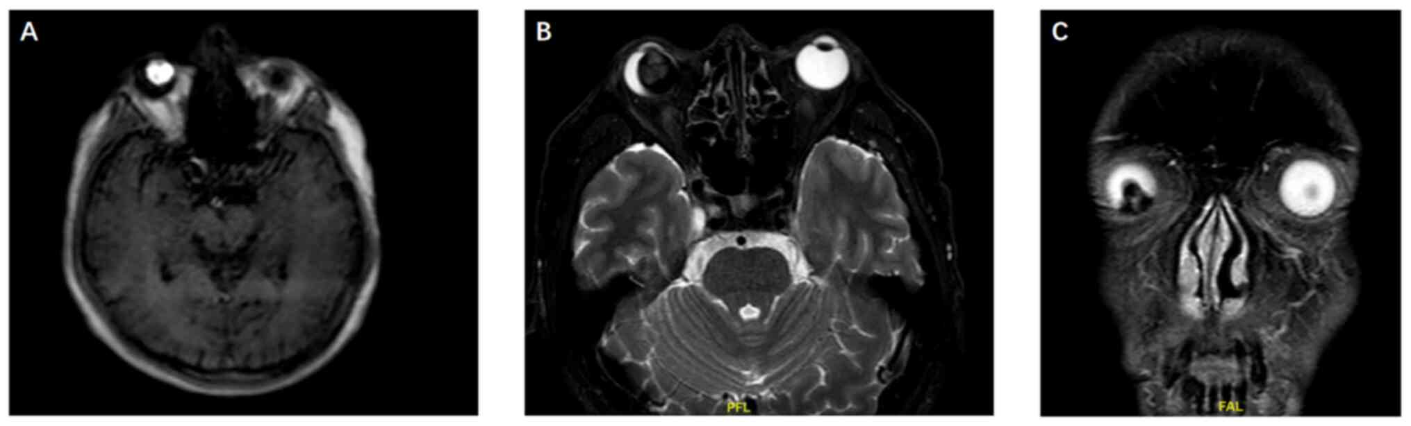 Ultrasound biomicroscopy of the right eye showed a shallow anterior chamber, bulging of the iris and a closed anterior chamber angle. The lens-iris diaphragm was displaced anteriorly (Fig. 2A), and a tumor was discovered in the ciliary body and choroid, which altered their structure (Fig. 2B and C). B-ultrasound and color Doppler ultrasound examinations revealed a hemispherical solid mass contiguous with the eyeball wall, with clear boundaries (Fig. 3). Orbital magnetic resonance imaging (MRI) demonstrated a T1 hyperintense, T2 hypointense lesion extending into the vitreous cavity from the lower part of the right eye. Due to the paramagnetic nature of melanin in tumors (12), MRI often exhibits characteristic features, namely high signal on T1WI and low signal on T2WI, which is different from most tumors that show a low to medium signal on T1WI and a medium to high signal on T2WI (13,14). These MRI features were strongly suggestive of malignant melanoma (Fig. 4). The lesion measured 16×18×14 mm and was closely associated with the posterior lens. Subsequent extensive systemic examinations, including brain, chest and abdominal CT scans, digestive and urological ultrasound scans, and positron emission tomography/CT-MRI, revealed no primary tumors in other parts of the body, which excluded the possibility of metastasis (Fig. S1, Fig. S2, Fig. S3).
