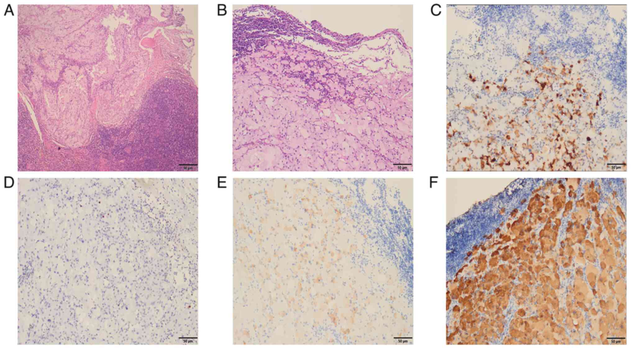 Immunohistochemistry was performed using the Envision method. Paraffin sections were dewaxed and hydrated. Boiling antigen repair solution [0.01 M citrate buffer (pH 6.0)] was added to the sample and incubated for 3 min after the autoclave valve jetted. After the repair solution was returned to room temperature, the sections were immersed in 3% methanol H2O2 for 10 min and washed with PBS three times for 3 min each time. The sections were then incubated with the HMB45 (undiluted; cat. no. MAB-0098; Fuzhou Maixin Biotechnology Development Co., Ltd.), MelanA (undiluted; cat. no. MAB-0275; Fuzhou Maixin Biotechnology Development Co., Ltd.), S-100 (undiluted; cat. no. Kit-0007; Fuzhou Maixin Biotechnology Development Co., Ltd.) and Ki-67 (1:500; cat. no. ZM-0167; Beijing Zhongshan Jinqiao Biotechnology Co., Ltd.) primary antibodies at 37°C for 1 h. The MaxVision TM3 HRP-Polymer (mouse/rabbit) IHC Kit (cat. no. KIT-5220; Fuzhou Maixin Biotechnology Development Co., Ltd.) secondary antibody was applied at 37°C for 30 min. Finally, the specimens were stained with MaxVision III Ultra DAB (cat. no. KIT0038; Biotechnology Development Co., Ltd.) at 37°C for 1 min, restained with hematoxylin (cat. no. BA4021; BaSO Biotech Co., Ltd.) at 37°C for 2 min, dehydrated by different concentrations of ethanol and cleared with xylene. The sections were sealed and then observed under a light microscope at ×100 magnification (Fig. 1C-F).