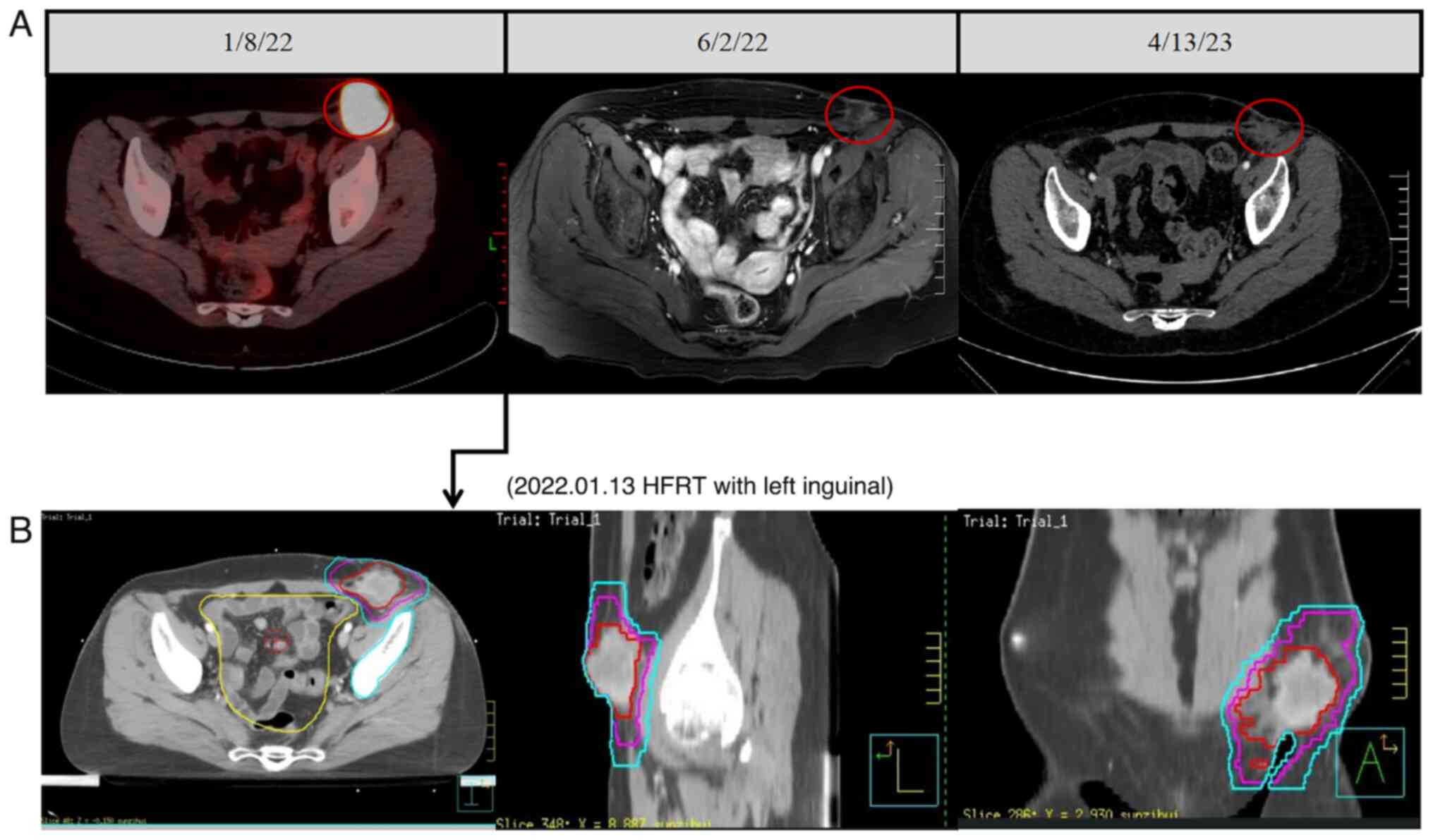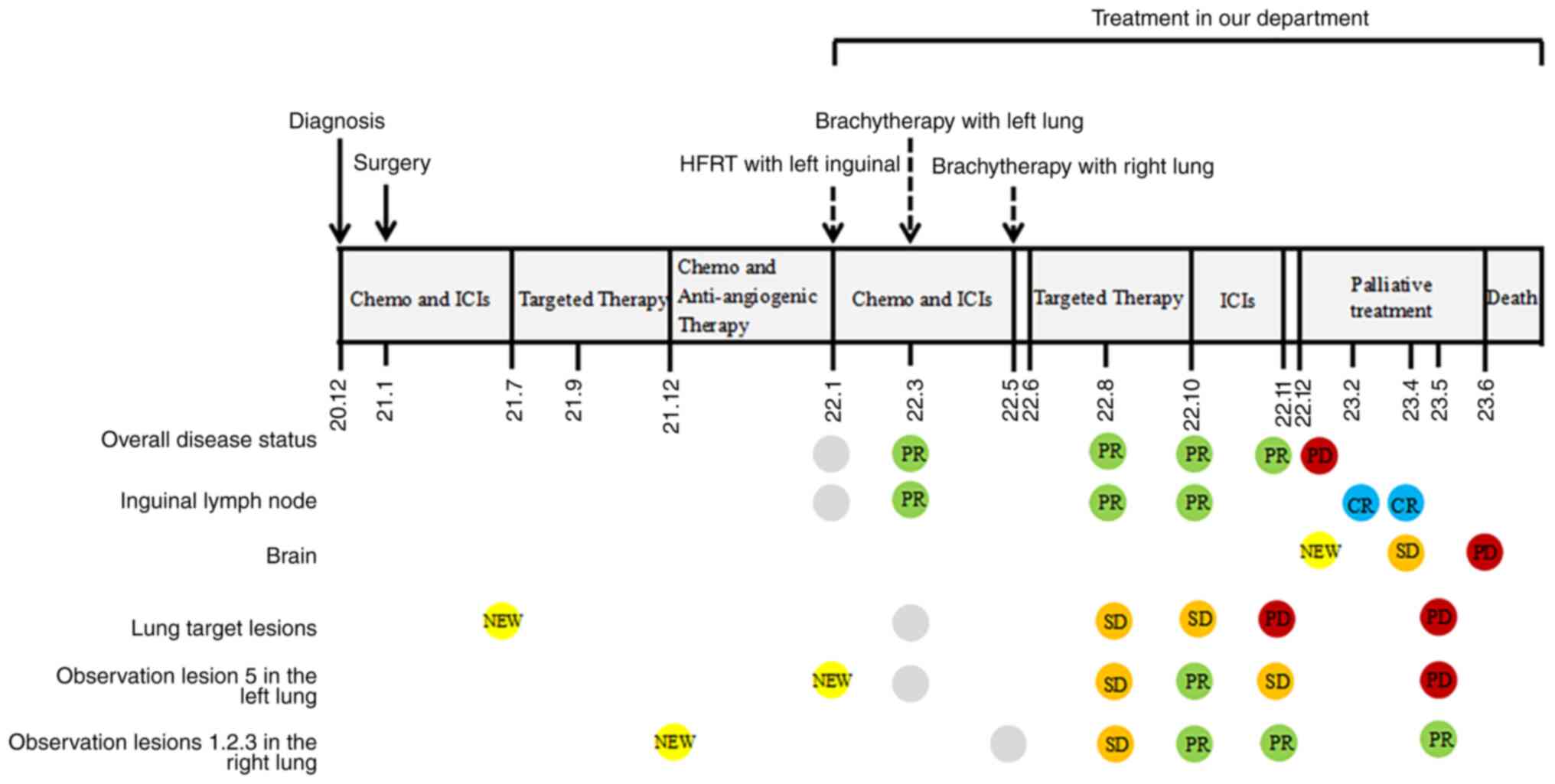 After the lung metastatic lesion was treated with single-fraction high-dose-rate brachytherapy, the time of lung radiotherapy lesion (target lesion) control was 8 months (Fig. 3). The observation lesions (observation lesions 1, 2, 3 and 5) adjacent to the target lesion received lower doses of scattering (0.9–1.8 Gy), and the time of lung observation lesion control was 9 months (except for observation lesion 4 in the right lung, which received a radiation dose of 7.8 Gy) (Figs. 3 and S1). After receiving HFRT for the left inguinal mass after immunotherapy, the radiotherapy target area continued to shrink, with a gradual relief of pain and discomfort and a significant improvement in the quality of life of the patient. In February 2023, an MRI showed no enlargement of multiple small lymph nodes in the bilateral inguinal area. The inguinal mass had largely disappeared, and the inguinal mass was assessed as complete response (CR; 100% regression of the lesion with no new lesions is considered CR) to treatment. After 2 months, the examination showed that the left inguinal mass was still under control (Fig. 2A), and the inguinal mass was still assessed as CR. The inguinal mass remained rated as CR until the death of the patient. The clinical history of the patient and the course of treatment are summarized in Fig. 4.
