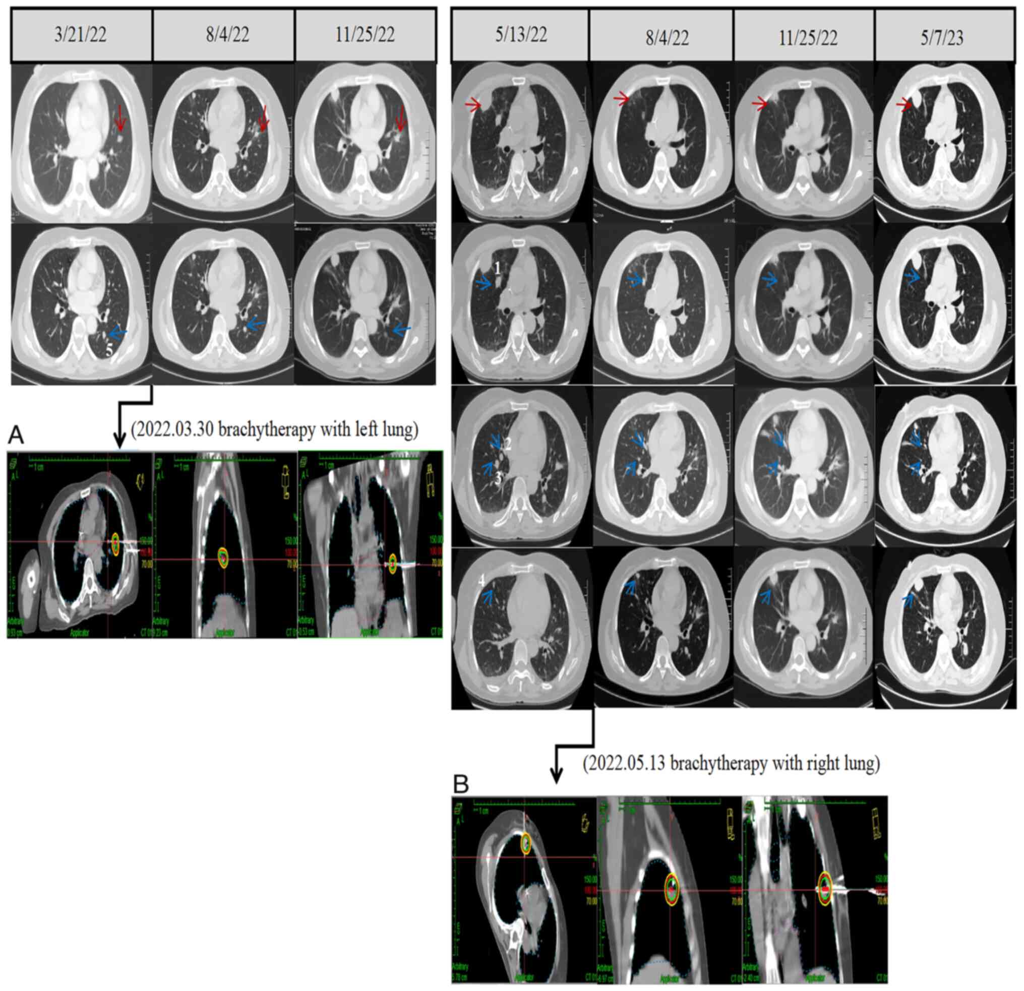 However, in January 2022, the patient consulted the Oncology Department of the Affiliated Hospital of Southwest Medical University (Luzhou, China) due to the persistent progression of the inguinal mass with pain and discomfort. PET/CT showed a soft tissue mass with increased glucose metabolism in the left inguinal region (diameter of ~48.9 mm) with a maximum standardized uptake value (SUVmax) of 17.5 (Fig. 2A). Multiple nodules were present in both lungs (the largest metastasis in the left lung tumor was 10.5 mm, and the largest in the right lung tumor was ~12.2 mm with a SUVmax of 2.9). After evaluation of the patient's condition in the Oncology Department, the patient underwent intensity-modulated radiation therapy for the left inguinal metastasis (3,414 cGy/7F) (Fig. 2B). Following radiotherapy for the left inguinal metastasis, the patient was treated with four cycles of pembrolizumab (200 mg, d0) and dacarbazine (385 mg, d1–5 po). During this period, owing to the increased and persistent lung metastases, the patient received single-fraction high-dose-rate brachytherapy, with a treatment dose of 49 Gy for the left lung metastases [D90 244 Gy by equivalent dose in 2-Gy fractions (EQD2)] (Fig. 3A) in March 2022 and 52 Gy for the right subpleural metastases (D90 269 Gy by EQD2) (Fig. 3B) 2 months later.