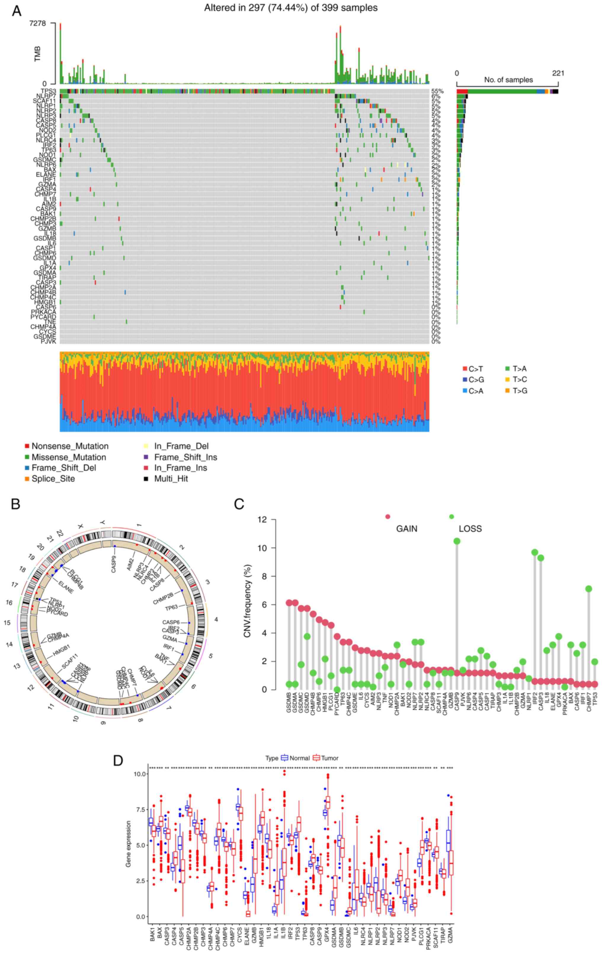 A flow chart of the present study is presented in Fig. S1. Using the mutation data from TCGA, the somatic mutations and copy number variations (CNVs) of 52 PRGs in CRC were analyzed. Among 399 patients, 297 exhibited PRG mutations, with a frequency of 74.44% (Fig. 1A). Among them, TP53 (55%) had the highest mutation frequency, followed by NLRP7 (6%). In total, 8 PRGs, including CASP6, PRKACA, PYCARD, TNF, CHMP4A, CYCS, GSDME and PJVK, did not show any mutations in the CRC samples. The location of CNVs of PRGs on chromosomes is shown in Fig. 1B. The CNV frequency of PRGs was also analyzed (Fig. 1C), and it was found that the copy number of most genes of the GSD family, such as GSDMA, GSDMB, GSDMC and GSDMD, was amplified, while CASP9, CASP3, IRF2 and CHMP7 were mainly deleted. Next, the mRNA expression levels of 52 PRGs were investigated (Fig. 1D). Compared with normal tissues, most PRGs with increased CNV, such as GSDMA and GSDMC, showed significantly higher expression in CRC samples, and an opposite pattern was observed for genes with decreased CNV, such as CASP9 and IRF2. However, for certain PRGs, such as GSDMB and TP53, the alterations of CNV may not be the main factor affecting their expression, as these PRGs with increased CNV had significantly decreased expression in tumor tissues. These findings suggest an uncertain association between the gene mutational intensity and expression level.