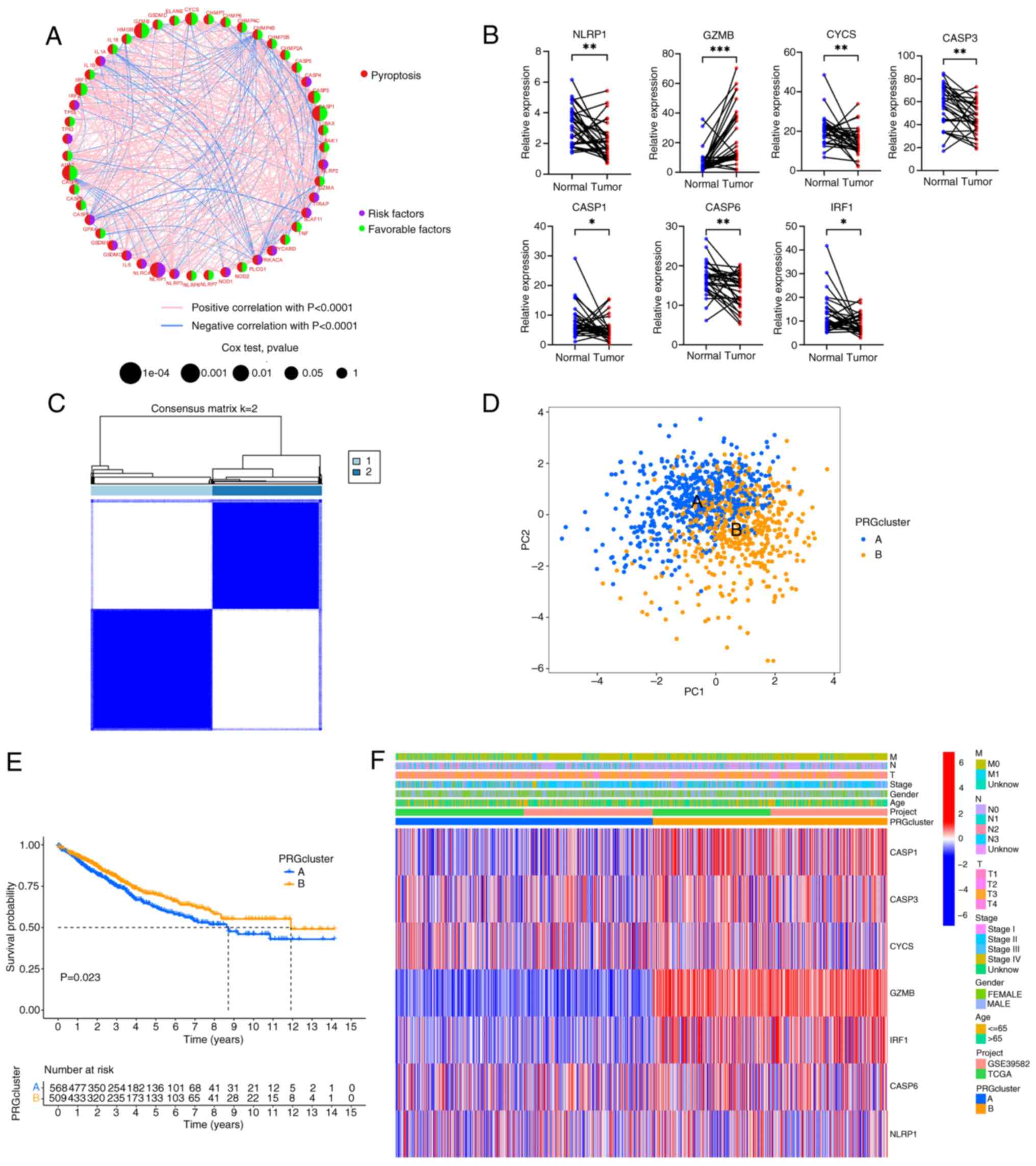 The data from 1,089 patients with CRC in TCGA and GSE39582 were integrated to investigate the potential biological function of PRGs (Table SIV). Univariate Cox and Kaplan-Meier analyses were conducted to reveal the prognostic values of the PRGs (Table SV). Then, according to the expression level and prognostic value of the PRGs, a correlation network was constructed (Fig. 2A and Table SVI). There were 7 PRGs (GZMB, CYCS, CASP3, CASP1, CASP6, IRF1 and NLRP1) with statistical significance in the univariate and Kaplan-Meier analyses (all P<0.05; Fig. S2 and Table SVII). Generally, if the upregulation of gene expression leads to a worse prognosis, the gene is termed a risk factor. Conversely, if the upregulation of a gene expression leads to an improved prognosis, the gene is termed a favorable factor. NLRP1 was the only risk factor, and increased expression of NLRP1 worsened the prognosis of CRC. By contrast, increased expression of GZMB, CYCS, CASP3, CASP1, CASP6 and IRF1 predicted a more favorable prognosis. The mRNA expression levels of the 7 genes were also verified by RT-qPCR using clinical samples obtained from Zhongshan People's Hospital (paired CRC tissues and adjacent normal tissues; n=30) (Fig. 2B). It was observed that, compared with the adjacent normal tissue, GZMB expression was elevated, while the expression of the other 6 genes (NLRP1, CYCS, CASP3, CASP1, CASP6 and IRF1) was decreased. Based on the expression patterns of the 7 PRGs, a consensus clustering and PCA analysis were performed. Notably, patients were clustered into two subtypes (clusters A and B; Fig. 2C and D). Furthermore, there were statistically significant differences in the prognosis of patients between clusters A and B (Fig. 2E). The differences in clinical features between the two groups of patients were also analyzed (Fig. 2F). It was found that there were no significant differences in the clinical characteristics between the two groups of patients, but the PRGs in cluster B were more inclined towards high expression, especially GZMB, IRF1, CASP1, CASP3 and CASP6.