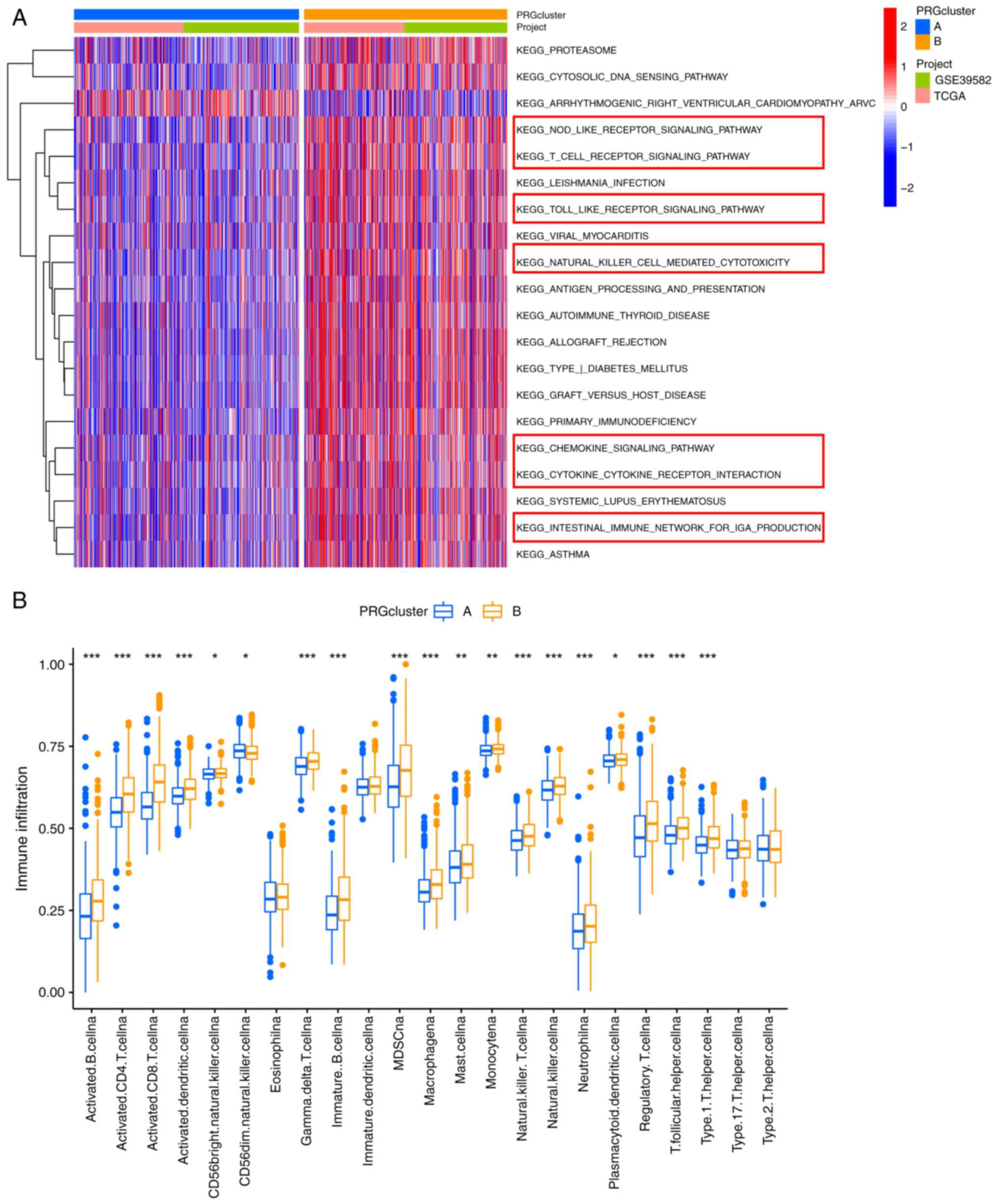A GSVA was conducted to investigate the differences in the biological signaling pathways of the PRG subgroups. Notably, cluster B was enriched in immune-associated pathways, such as ‘NOD-LIKE RECEPTOR SIGNALING PATHWAY’, ‘T CELL RECEPTOR SIGNALING PATHWAY’, ‘CHEMOKINE SIGNALING PATHWAY’ and ‘NATURAL KILLER CELL-MEDIATED CYTOTOXICITY’ (Fig. 3A). Therefore, we speculated that cluster B may have a more favorable prognosis than cluster A due to the rich immune cell infiltration in its TME. The CIBERSORT algorithm was used to estimate the infiltration levels of 23 types of immune cells and verify our hypothesis. As expected the abundance of almost all immune cells was significantly increased in cluster B (Fig. 3B).