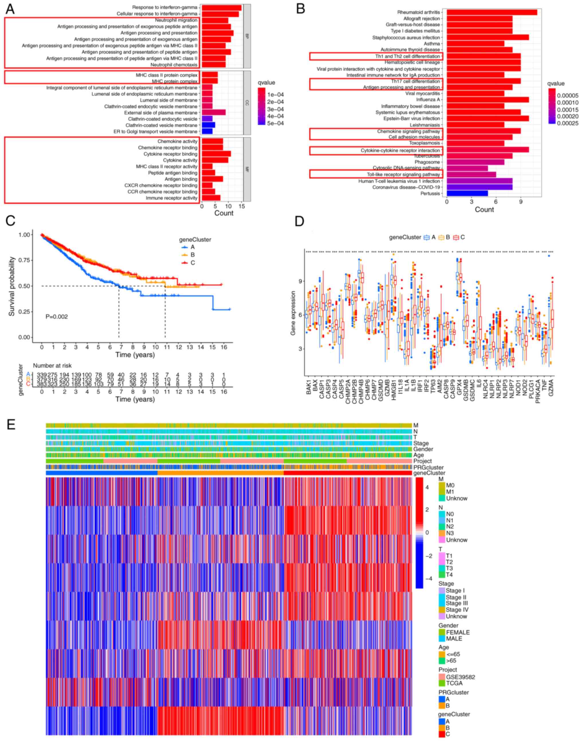Considering that phenotypic changes are closely related to differential expression of genes, the expression levels of all genes were analyzed using the ‘limma’ package and 76 DEGs between clusters A and B were obtained (Table SVIII). Next, functional enrichment analysis was conducted to explore the underlying biological function of these DEGs. Both GO and KEGG analyses showed that DEGs were mainly enriched in immunomodulation-associated pathways (Fig. 4A and B). Then, univariate Cox analysis was performed and 9 DEGs (P<0.01) with significant effects on survival were identified (Table SIX). A consensus clustering analysis was performed and patients were divided into three gene clusters (clusters A-C) to investigate the specific prognostic value of the 9 DEGs (Fig. S3). It was found that patients in cluster A had the shortest OS (Fig. 4C). The expression of most PRGs was significantly different in the three gene clusters (Fig. 4D). The relationship between the three gene clusters and clinicopathologic features is shown in Fig. 4E.