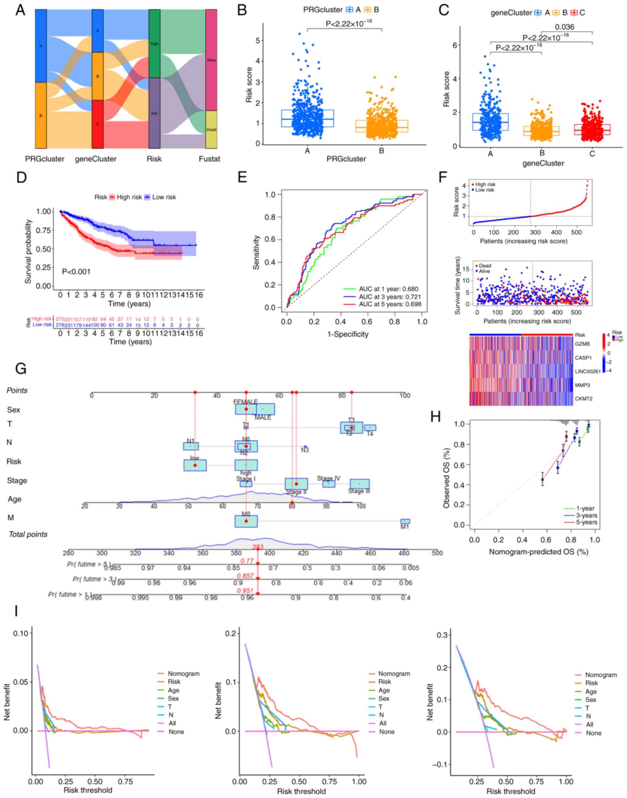 As the PRG risk score was closely related to the OS of patients with CRC, by integrating the PRG risk score and clinical parameters, a nomogram was constructed to predict the 1-, 3- and 5-year OS of patients with CRC (Fig. 5G). The calibration curve of the nomogram is shown in Fig. 5H, implying great accuracy between actual observations and predicted values. Decision curve analysis indicated that the nomogram curve was higher than the other curves, suggesting that within the high-risk threshold range (0 to 1), the prediction results of the nomogram model may better guide clinical decision-making (Fig. 5I).