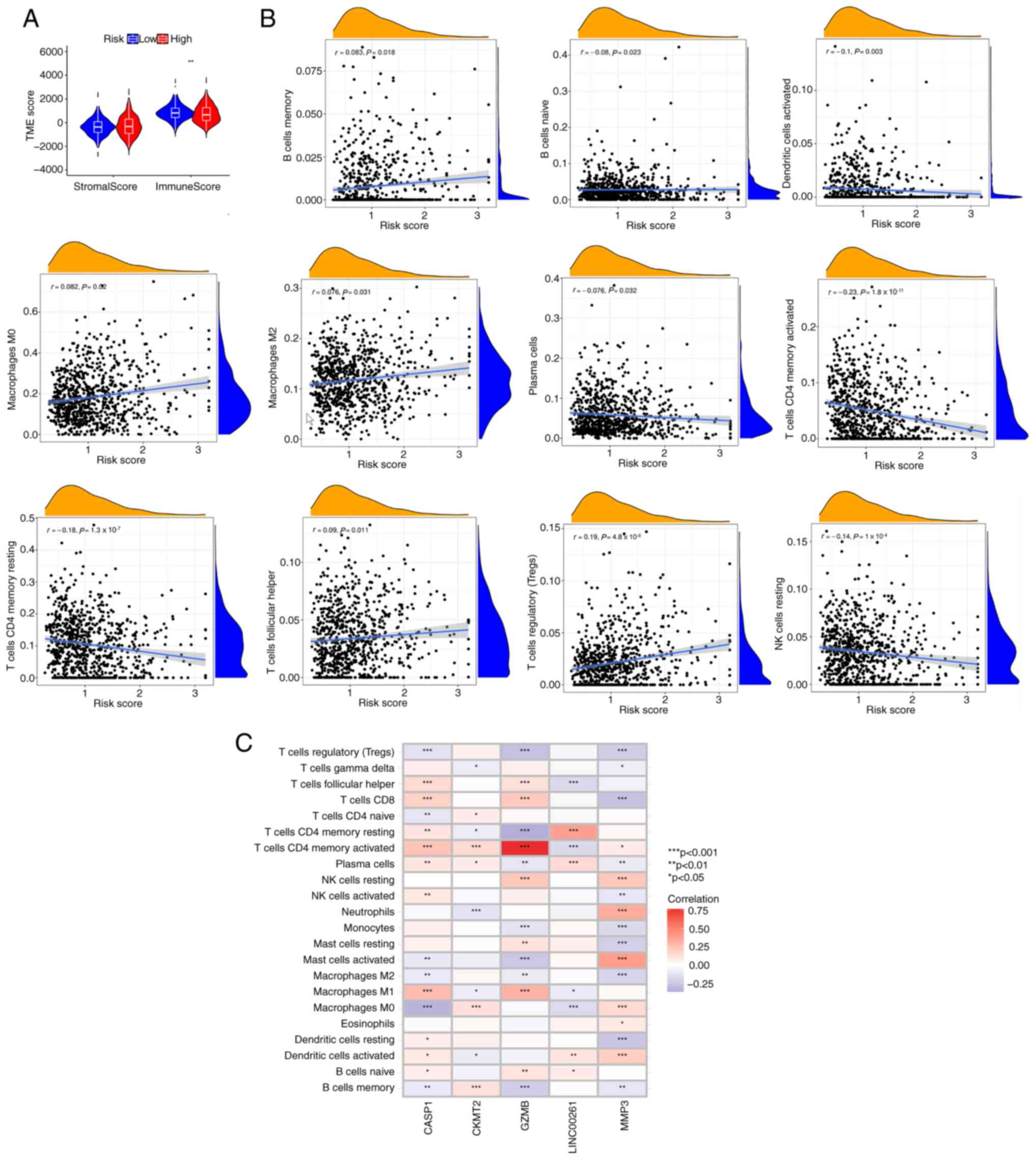 The most important components of the TME are stromal cells and immune cells, and the immune score calculated using the ESTIMATE algorithm is an important index to assess the TME (29,30). The correlation between the PRG risk score and the immune score was analyzed. It was noted that the PRG risk score was inversely associated with the immune score (Fig. 6A), suggesting that the PRG risk score could be used to evaluate the abundance of immune cells in the TME of CRC. In addition, it was demonstrated that the PRG risk score was positively correlated with the abundance of M0 macrophages Tregs, M2 macrophages, memory B cells and follicular helper T cells, whereas it was negatively correlated with the abundance of naive B cells, activated dendritic cells, resting natural killer cells, plasma cells, resting memory CD4+ T cells and activated memory CD4+ T cells (Fig. 6B). This suggests that CRC tumors with high PRG risk scores may have a tumor immune microenvironment more prone to immune evasion. The correlation between GZMB, CASP1, LINC00261, MMP3 and CKMT2 and immune cell infiltration was also explored. Most immune cells were closely related to the 5 genes (Fig. 6C). Among these 5 genes, the expression levels of CASP1, GZMB and MMP3 were significantly correlated with almost all immune cells, suggesting that they are most critical in CRC immune cell infiltration. In particular, GZMB showed a strong positive correlation with the activated memory CD4+ T cells.