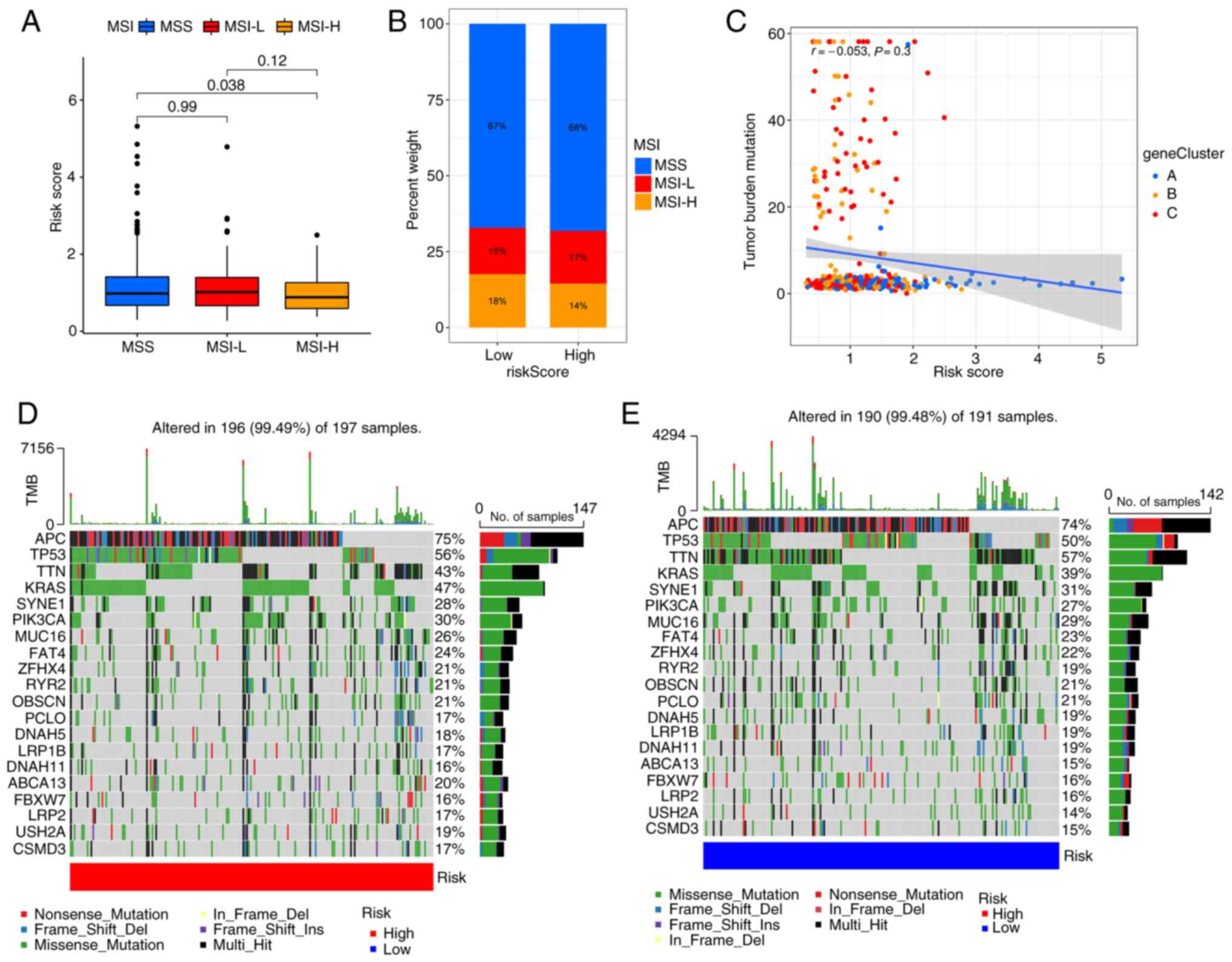 A number of studies have demonstrated that MSI is associated with the efficacy of immune checkpoint inhibitors. Patients with MSI-high can benefit from immune checkpoint inhibitors (31–34). The results suggest that patients with high PRG risk scores are more likely to have microsatellite stability (Fig. 7A and B). These findings indicate that patients with low PRG risk scores are more likely to benefit from immune checkpoint inhibitors. Consistent with the results of the MSI analysis, correlation analysis indicated that the PRG risk score is negatively associated with tumor mutation burden (Fig. 7C), although the P-value was not statistically significant. The somatic mutation distribution of different patterns of PRG risk scores in TCGA dataset were also investigated. The results showed that APC, TP53, KRAS and PIK3CA mutations were more common in the high PRG risk score subgroup (Fig. 7D and E). Previous studies (35–37) have shown that these 4 genes are the key genes in the development of CRC.