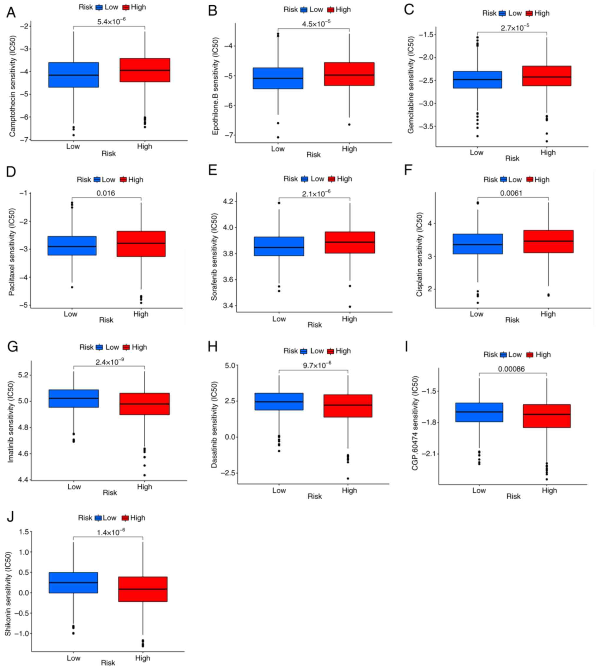 The IC50 values of 138 antitumor drugs in TCGA database were measured to determine whether the PRG risk score could predict the response to antitumor drugs. It was found that patients with low PRG risk scores were sensitive to cisplatin, paclitaxel, gemcitabine, sorafenib, camptothecin and Epothilone.B. (Fig. 8A-F), while patients with high PRG risk scores were sensitive to imatinib, dasatinib, shikonin and CGP.60474 (VEGFR-2 inhibitor) (Fig. 8G-J).