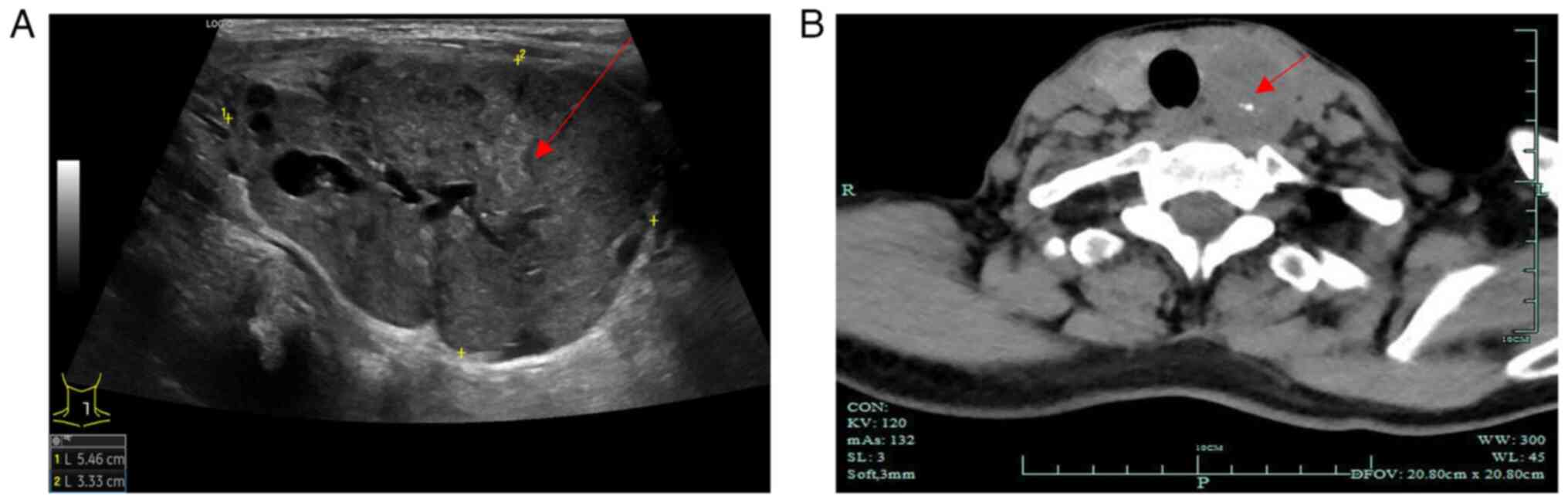 In April 2023, a 60-year-old female was referred to Ningbo Beilun District People's Hospital (Ningbo, China) with radiographic findings indicating thyroid nodules. The previous medical history of the patient included a left radical nephrectomy in February 2021, performed for the treatment of ccRCC. Histological examination revealed grade 1 ccRCC (23), and no other distant metastases were observed during follow-up. As shown in Fig. 1A, preoperative thyroid ultrasound examination results indicated a hypoechoic nodule in the left lobe of the thyroid [Thyroid Imaging Reporting and Data System (TI-RADS) 4a] and a nodule in the right lobe of the thyroid (TI-RADS 3). TI-RADS is a classification level for thyroid nodules, where TI-RADS 4a indicates the presence of one of the following ultrasonographic malignant features: Extremely hypoechoic, microcalcifications or irregular microlobulated margins; the probability of malignancy in this category ranges from 5 to 10% (24). The results of computed tomography revealed enlargement of the left lobe of the thyroid with a mass-like low-density shadow inside, measuring ~40×32 mm (Fig. 1B). In addition, the left lobe exhibited poorly defined borders and an uneven density with visible calcifications inside the mass (Fig. 1B). Multiple small nodules were observed in the right lobe of the thyroid, with no abnormal density shadows observed in the isthmus of the thyroid. Notably, the patient did not present with enlarged lymph nodes on either side of the neck. The results of urine and blood tests were normal, and normal functioning of the thyroid and parathyroid was observed. Given the large size of the mass, there was a risk of tracheal deviation and compression. The patient's history of ccRCC and the potential for malignancy in the thyroid nodules was considered, and after the patient was informed, they refused fine needle aspiration cytology and opted for total thyroidectomy.