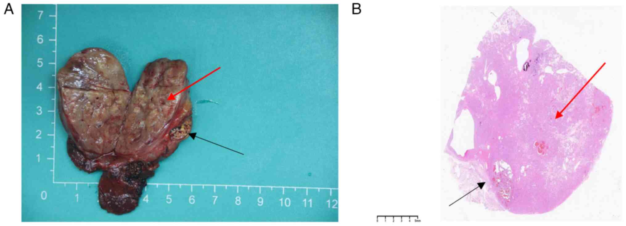 Immunohistochemical analyses were performed automatically using the Bench Mark ULTRA immunohistochemistry system (Ventana Medical Systems, Inc.), for which the paraffin-embedded tissues were sectioned (4 µm) using a paraffin slicing machine, mounted onto poly-L-lysine-coated glass slides and allowed to dry at 65°C for 60 min. The sections were subsequently put into the immunohistochemistry instrument for automated antigen retrieval (pH 9.0 EDTA, 100°C, 36 min) and blocking (3% hydrogen peroxide, 37°C, 4 min), followed by incubation with primary antibodies and the secondary antibody, and chromogenic development. The sections were incubated with the following primary antibodies: Neural cell adhesion molecule (CD56; mouse; cat. no. MAB-0743), TTF-1 (mouse; cat. no. MAB-0599), cytokeratin 19 (CK19; mouse; cat. no. MAB-0829), chromogranin-A (CgA; rabbit; cat. no. RMA-0548), paired box 8 (PAX-8; mouse; cat. no. MAB-0837), carbonic anhydrase IX (CAIX; rabbit; cat. no. RAB-0615), CD10 (mouse; cat. no. MAB-0668), mucin-1 (MUC-1; mouse; cat. no. Kit-0011), cytokeratin 7 (CK7; mouse; cat. no. MAB-0828), Ki-67 (mouse; cat. no. MAB-0672) (all from Fuzhou Maixin Biotechnology Development Co., Ltd.) and BRAF-VE600E (mouse; cat. no. 790-5095; Roche Diagnostics) for 1 h at 37°C. The bound primary antibody was detected using a ready-to-use secondary antibody (UltraView Universal DAB detection kit; cat. no. 760-500; Roche Diagnostics) for 36 min at 37°C, and DAB (from the UltraView Universal DAB detection kit) was utilized as a chromogen for 8 min at 37°C. After removing the sections from the instrument, they were immersed in distilled water containing detergent for washing and then rinsed with distilled water. Subsequently, the sections were dehydrated through a series of ethanol solutions and cleared with xylene before mounting the sections in an automated slide stainer. The sections were then ready to be observed under a microscope (Leica Microsystems, Inc. DM2000). A tumor measuring 55×41×33 mm was observed in the left thyroid tissue section. In addition, the tumor appeared gray-yellow in color, with areas of hemorrhage and a fibrous capsule on the periphery. A small area of ~8×5 mm was visible near the periphery of the tumor, with a multicolored appearance (Fig. 2A).