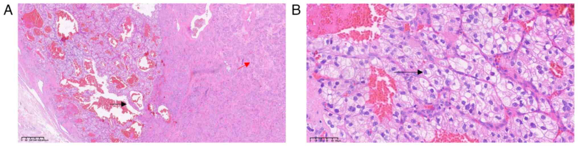 In the 11 previously reported cases of ccRCC metastases to PTTs, there were four instances of the follicular variant of papillary thyroid carcinoma (9–12), four cases of follicular adenoma (5,13–15), one case of papillary thyroid carcinoma (16), one case of Hurthle cell (oncocytic) carcinoma (15) and one case of Hurthle cell adenoma (17). Although all cases were metastatic to thyroid tumors following ccRCC-mediated radical nephrectomy, the histological features and biological behaviors of the tumor included in the present study differed from those previously reported. Among the 11 cases reported, there were 4 cases of follicular adenoma and 1 case of Hurthle cell adenoma, both of which were benign tumors. The morphology of their tumor tissues was characterized by complete encapsulation. However, they also exhibited certain distinct features. Specifically, Hurthle cell adenoma presented with abundant granules in the eosinophilic cytoplasm, whilst follicular adenoma displayed cells arranged in follicles of varying sizes. None of these five cases showed metastasis to other organs. The remaining six cases were malignant tumors. The follicular variant of papillary thyroid carcinoma displayed follicles of varying sizes and shared characteristics with papillary thyroid carcinoma cells. Both Hurthle cell (oncocytic) carcinoma and papillary thyroid carcinoma demonstrated invasive growth. Among these malignant cases, four cases exhibited metastasis to other organs, including the liver, pancreas, contralateral kidney, spine and subcutaneous tissue. In the present case, the tumor cell exhibited unique clear cell alterations with hyaline stroma, which was different from previously reported cases. The biological behavior of the tumor was intermediate between that of benign and malignant tumors, showing differences from both.
