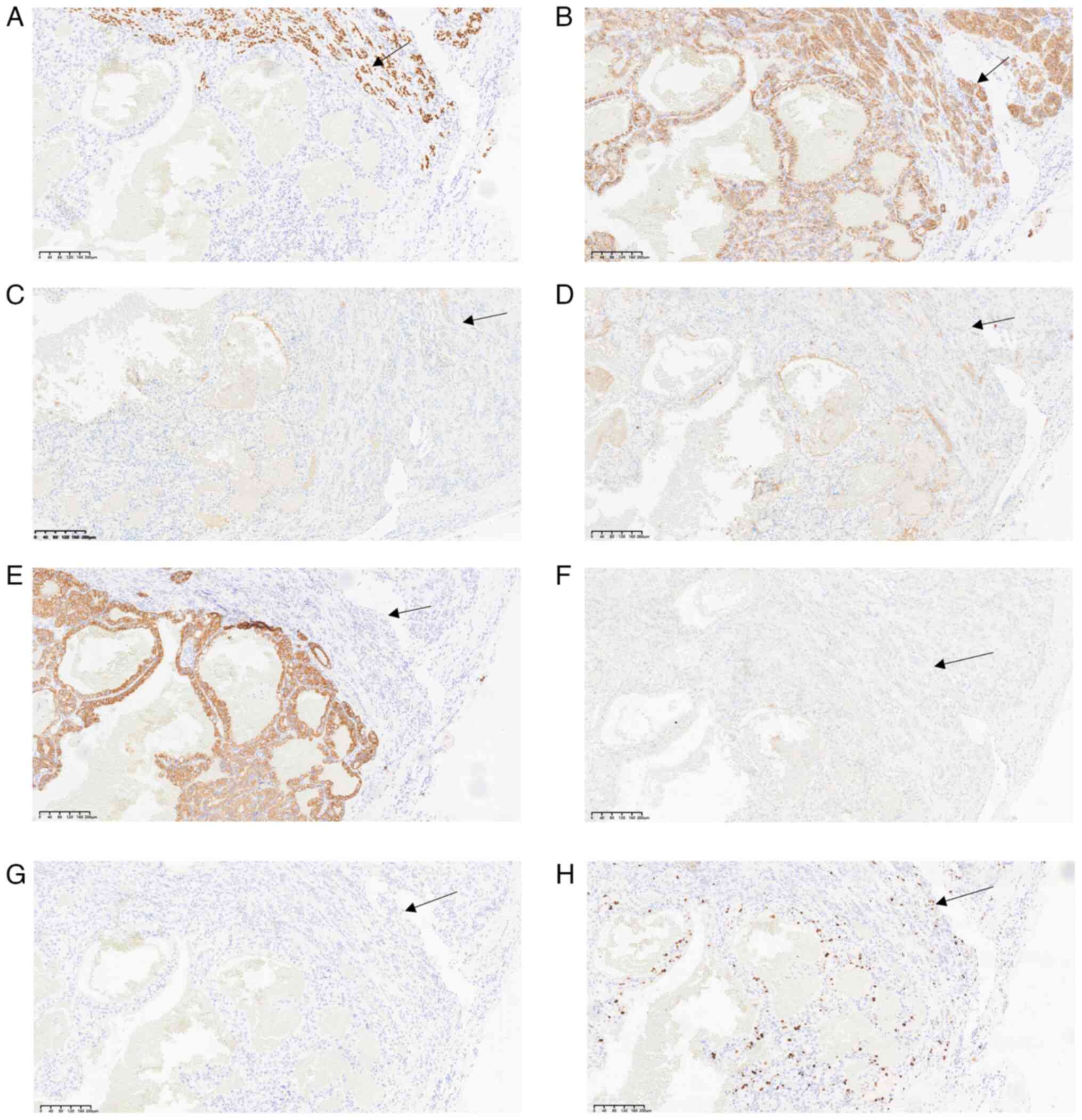 Immunohistochemical analysis revealed that clear trabecular areas of the thyroid exhibited positive TTF-1 (Fig. 4A) and CD56 staining (Fig. 4B), whilst calcitonin (Fig. 4C), mesothelin (Fig. 4D), CK19 (Fig. 4E), BRAF-V600E (Fig. 4F) and CgA (Fig. 4G) expression was negative. Positivity for Ki-67 was <5% of tumor cells (Fig. 4H). By contrast, the clear cell areas exhibited positive PAX-8 (Fig. 5A), CAIX (Fig. 5B), CD10 (Fig. 5C), vimentin (Fig. 5D) and MUC-1 (Fig. 5E) expression, while CK7 (Fig. 5F) expression was negative. The observed histological features and immune profile were consistent with metastatic ccRCC to the thyroid, with clear cell changes in the lamellar tumor.
