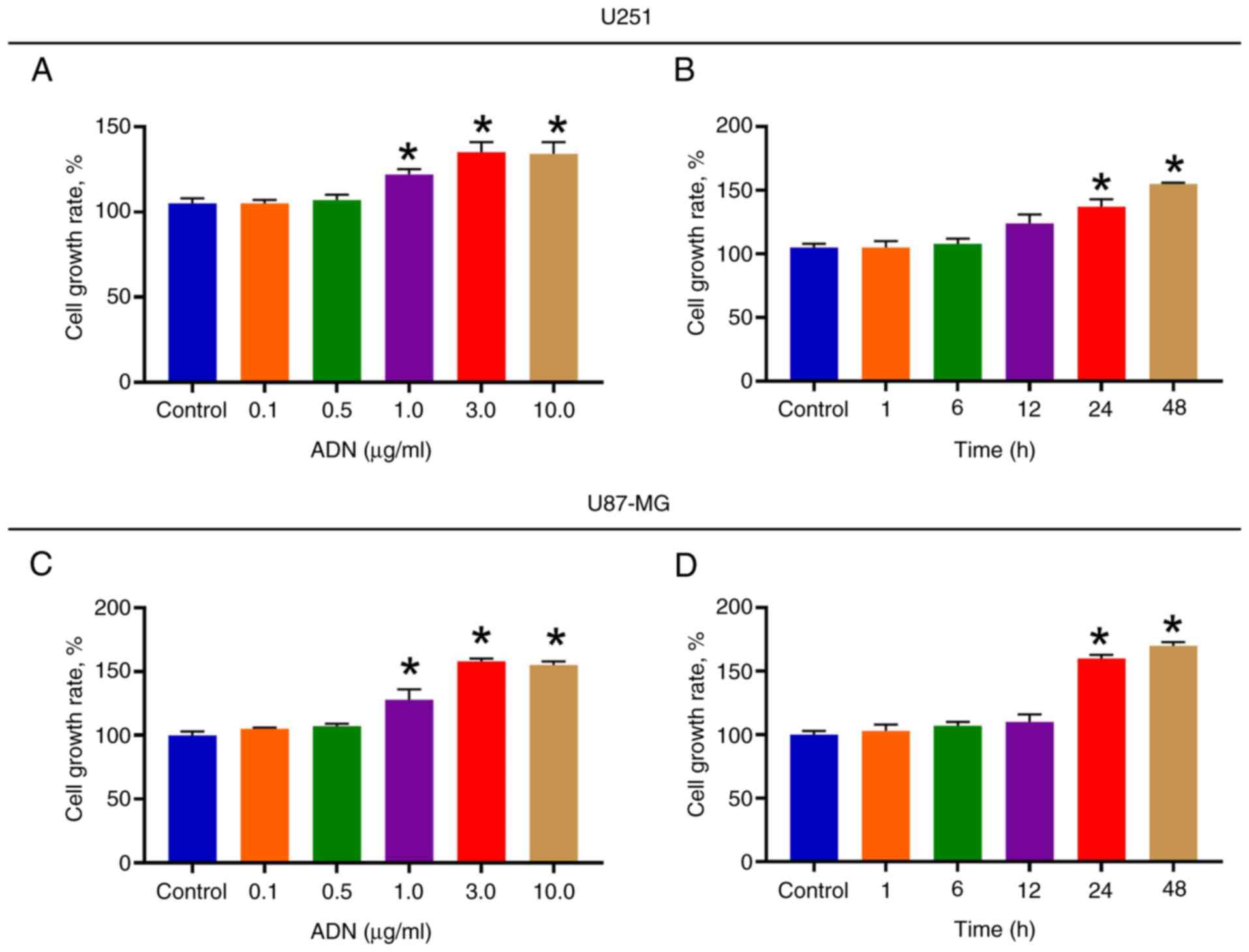 U251 cell growth rate was increased following treatment with 1.0, 3.0 and 10.0 µg/ml ADN compared with that noted in the control (all P<0.05; Fig. 1A). Subsequently, U251 cells were treated with 3.0 µg/ml ADN at different time points. It was found that following ADN treatment for 24 and 48 h, U251 cell growth rate was increased compared with that of the control (both P<0.05; Fig. 1B). Similarly, the effect of ADN on the U87-MG cell growth rate further indicated a concentration-dependent (Fig. 1C) and time-dependent (Fig. 1D) mode of action. It was noted that when the treatment duration was 24 h, ADN exhibited an optimal effect in promoting U251 and U87-MG cell growth. In addition, compared with the treatment duration of 24 h, the effect of ADN on U251 and U87-MG cell growth was not further promoted after 48 h (both P>0.05). Therefore, the treatment duration of ADN for 24 h was selected as the experimental condition for subsequent experiments.