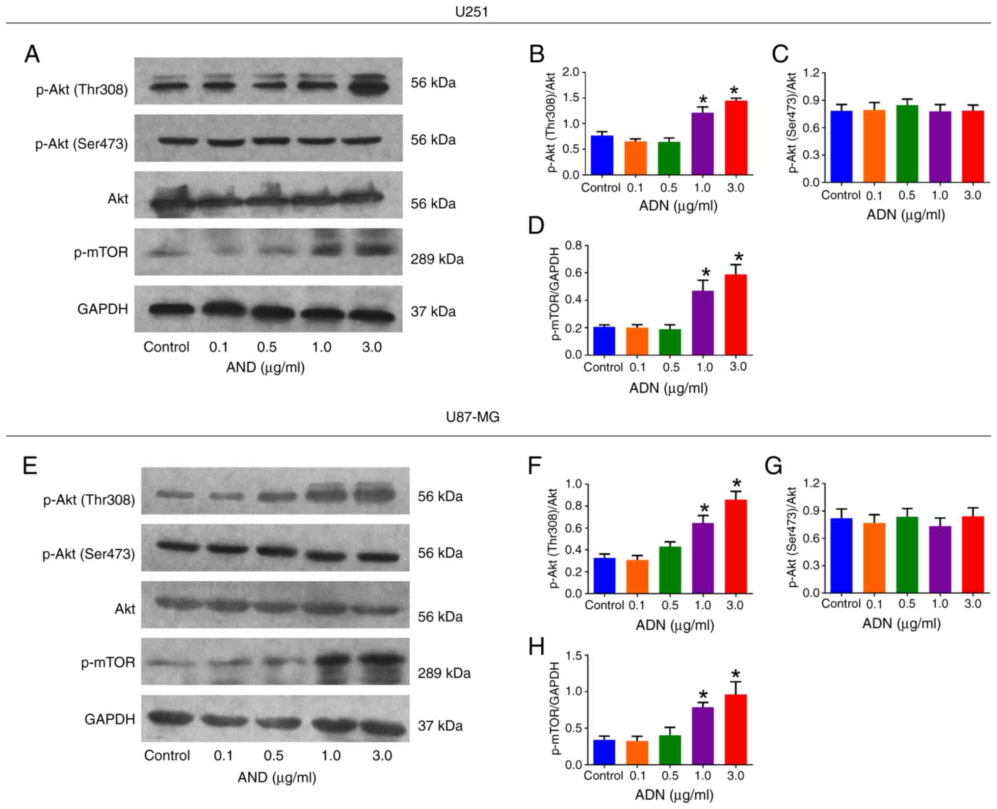 According to western blotting analysis (Fig. 2A), p-Akt (Thr308)/Akt was elevated following 1.0 and 3.0 µg/ml treatment with ADN compared with that of the control in U251 cells (both P<0.05; Fig. 2B). However, p-Akt (Ser473)/Akt was not affected by ADN treatment at any concentration used in U251 cells (all P>0.05; Fig. 2C). p-mTOR/GAPDH was increased following treatment with 1.0 and 3.0 µg/ml ADN compared with those of the control in U251 cells (both P<0.05; Fig. 2D). The same trends were also noted in U87-MG cells (Fig. 2E-H).