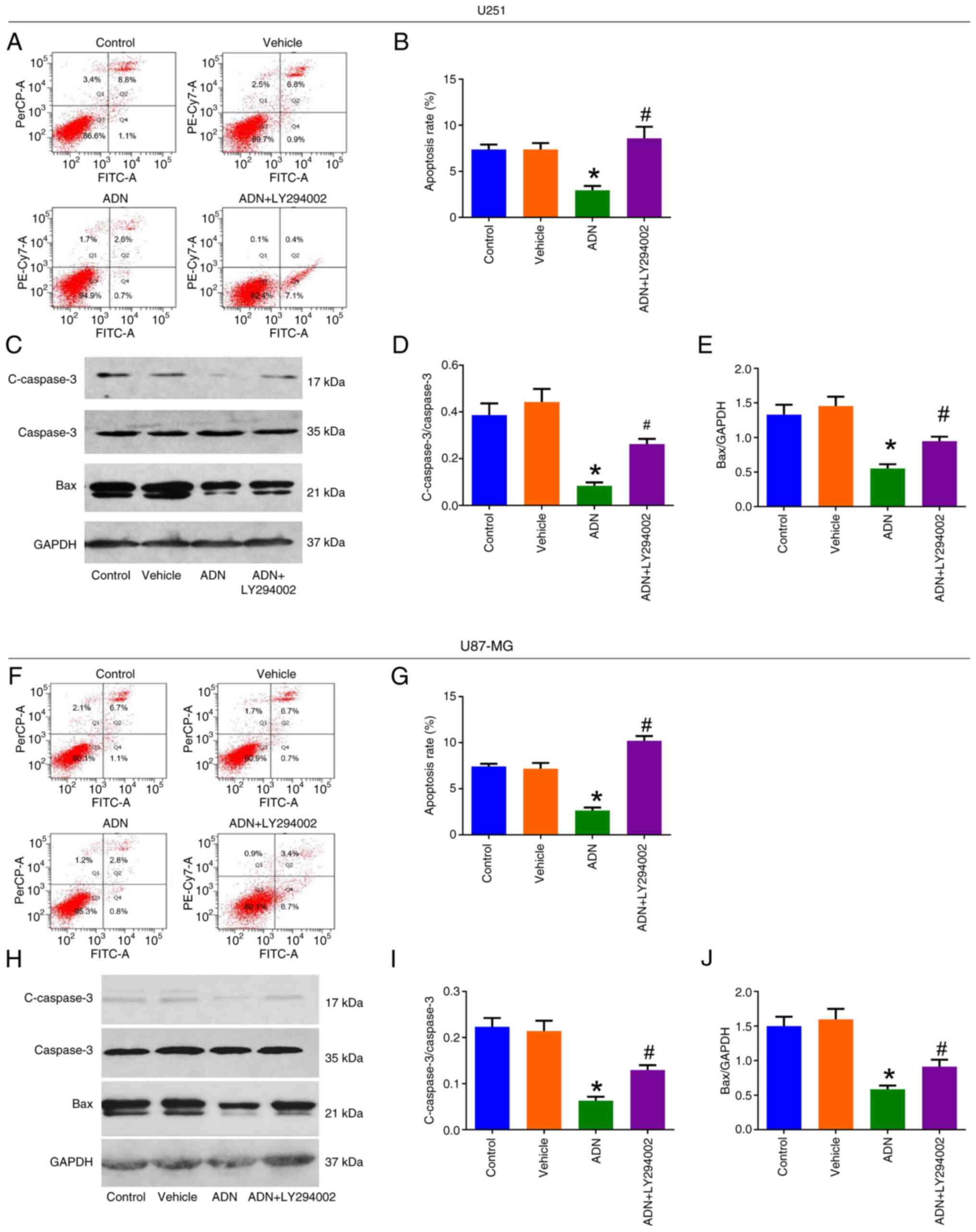 LY294002 (a PI3K inhibitor; cat. no. ab120243; Abcam) was dissolved in dimethyl sulfoxide (cat. no. PHR1309; MilliporeSigma) for further treatment. Subsequently, U251 and U87-MG cells were treated with 10 µM LY294002 in combination with ADN for 24 h at 37°C. Furthermore, the apoptotic rate was assessed by Annexin V/propidium iodide (AV/PI). The expression levels of cleaved caspase 3 (c-caspase 3), caspase 3 and Bax were evaluated by western blotting.