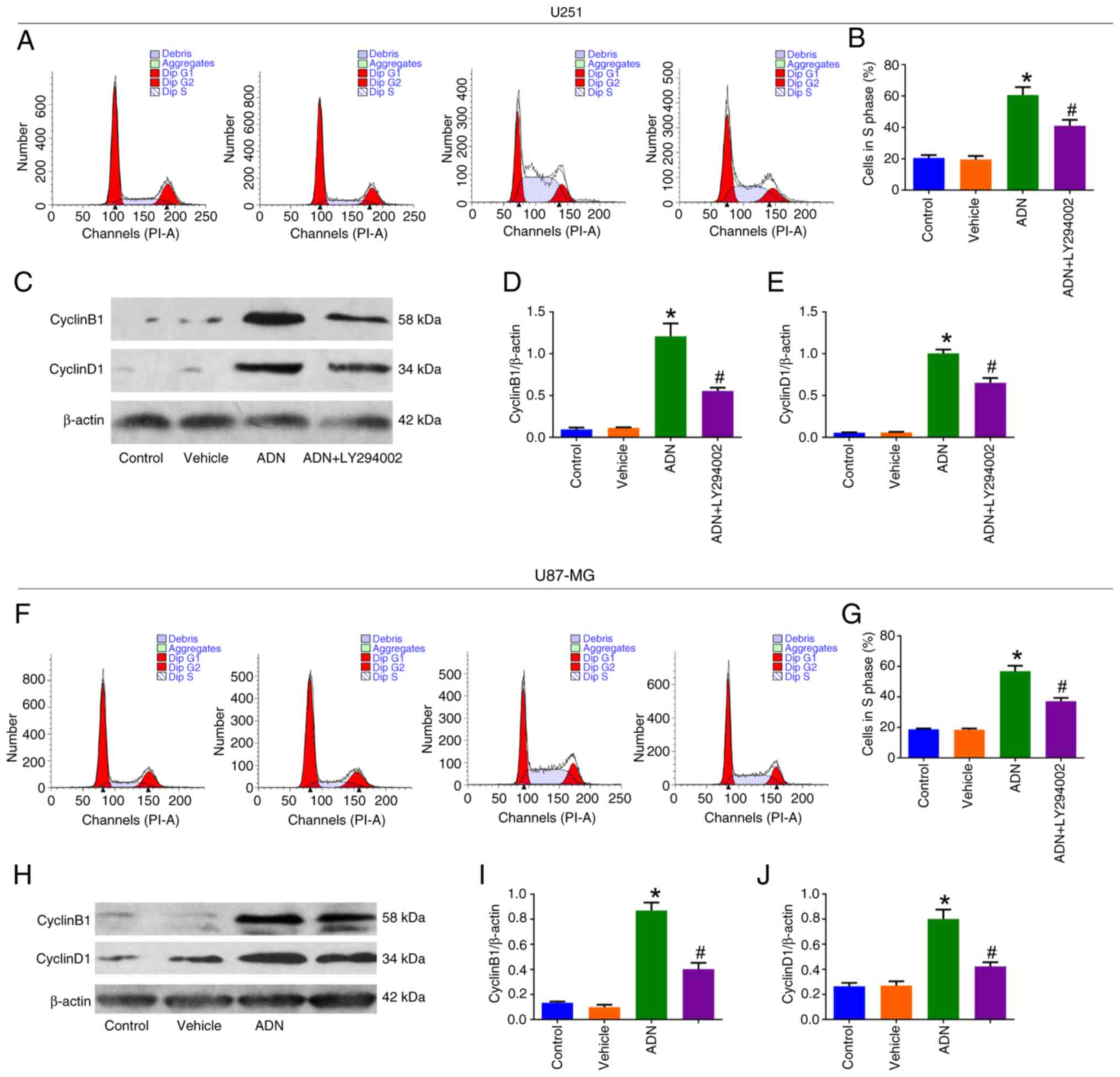 According to cell cycle assay results (Fig. 4A), the proportion of U251 cells in the S phase was increased by ADN treatment compared with the vehicle (P<0.05); however, it was reduced by ADN + LY294002 compared with ADN (P<0.05; Fig. 4B). Western blotting (Fig. 4C) indicated that cyclin B1/β-actin (Fig. 4D) and cyclin D1/β-actin (Fig. 4E) were increased following treatment with ADN compared with the vehicle (P<0.05); however, they were decreased by ADN + LY294002 compared with ADN in U251 cells (P<0.05). Similar trends were noted in U87-MG cells (Fig. 4F-J).