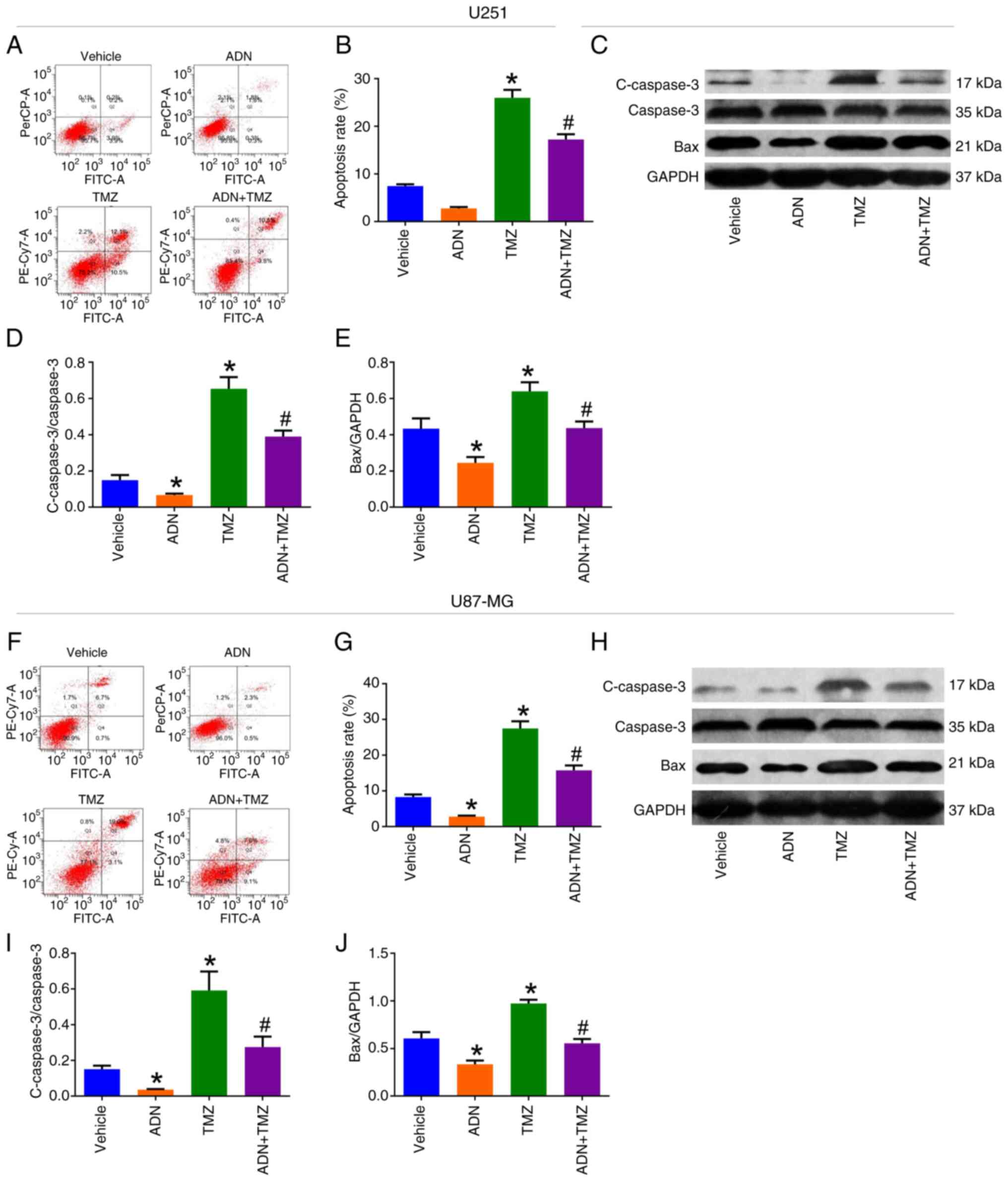 TMZ (cat. no. ab141055; Abcam) at concentrations of 0.1 and 1.0 mM were cultured with U251 and U87-MG cells, respectively. ADN with concentrations of 1, 2 and 3 µg/ml were cultured with cells in combination with TMZ at 0.1 and 1.0 mM at 37°C for 24 h. The mixture of 1.0 mM TMZ, 3 µg/ml ADN and 10 µM LY294002 was also added to the cells. Finally, 1 mM TMZ or LY294002 was cultured with the cells in the presence of 3 µg/ml ADN at 37°C for 24 h. Subsequently, the cell growth rate was assessed using CCK-8, the apoptotic rate and cell cycle were evaluated using AV/PI assay and cell cycle assay; the expression levels of c-caspase 3, caspase 3, Bax, cyclin B1 and cyclin D1 were determined by western blotting.