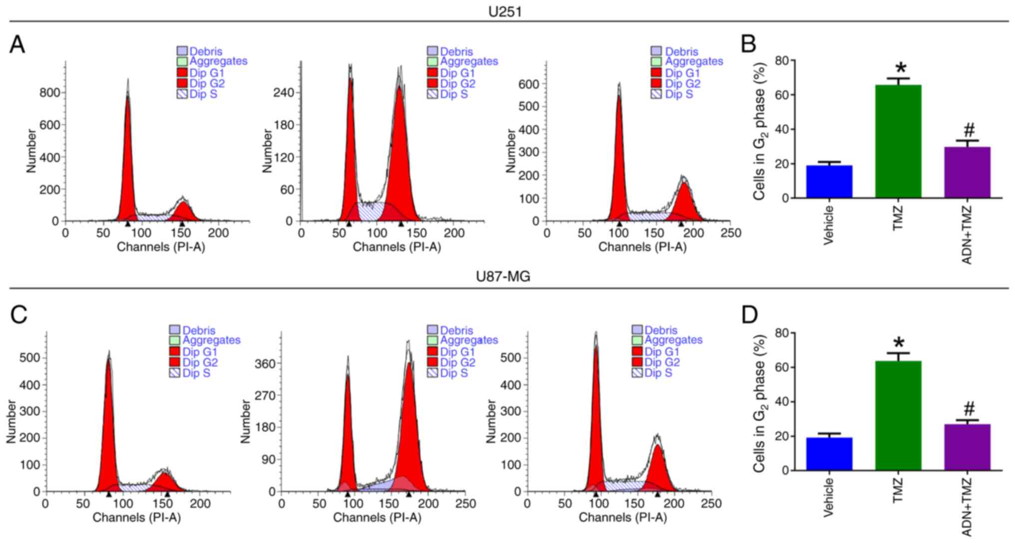 The cell cycle assay (Fig. 6A) suggested that the proportion of U251 cells in the G2 phase was increased by TMZ compared with that of the vehicle group (P<0.05), whereas it was decreased in the ADN+TMZ group compared with that noted in the TMZ group (P<0.05; Fig. 6B). The same trends were noted in U87-MG cells (Fig. 6C and D).