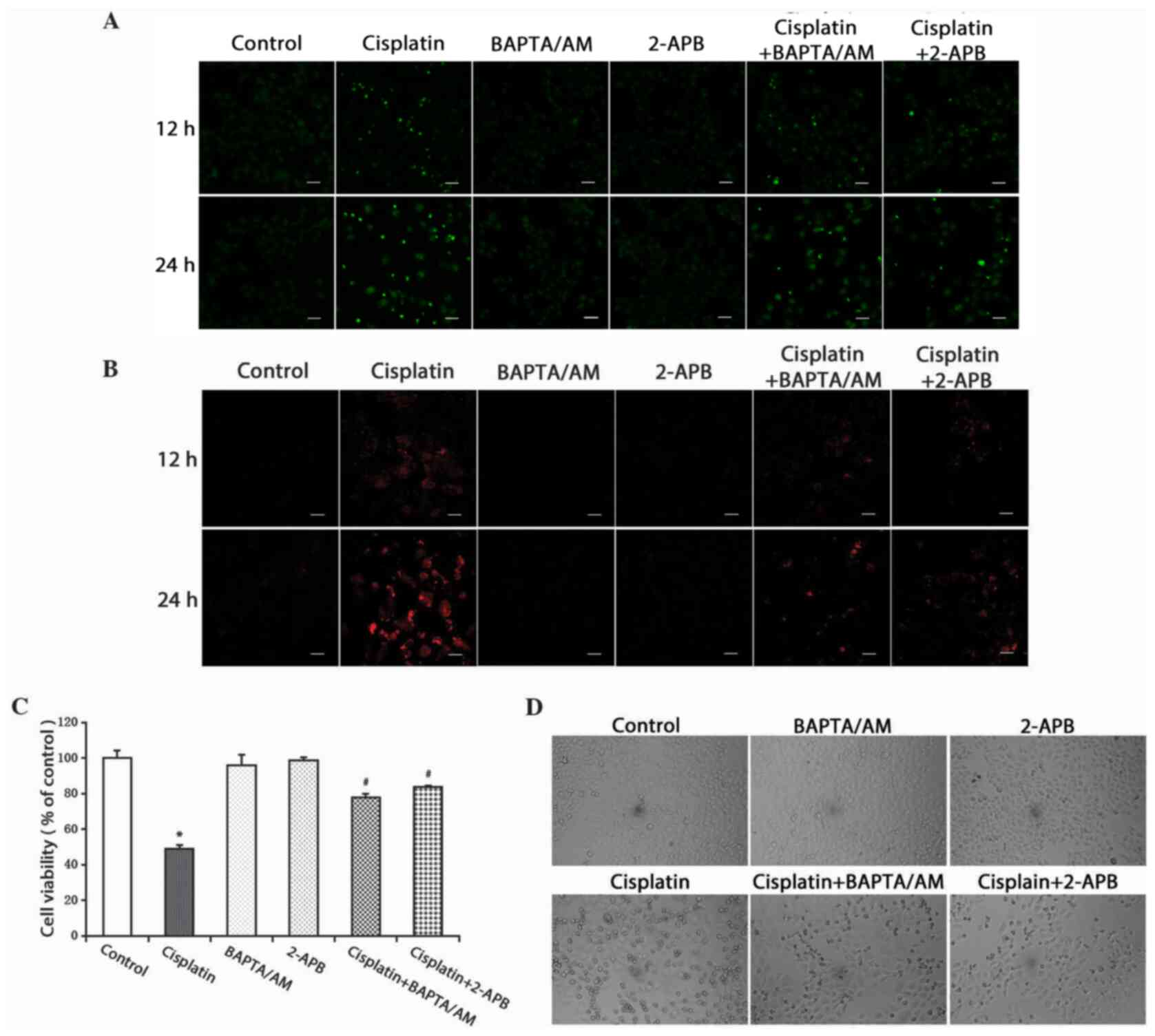 The authors consulted their original data, and realized that this figure had inadvertently been assembled incorrectly. The revised version of Fig. 2, now showing the correct data panel for the ‘Cisplatin + 2-APB’ experiment, is shown on the next page. The authors regret the error that was made during the preparation of this figure, although they were able to confirm that this error did not seriously affect the conclusions reported in the paper. The authors are grateful to the editor of Oncology Letters for allowing them the opportunity to publish this Corrigendum; furthermore, they apologize to the readership for any inconvenience caused.