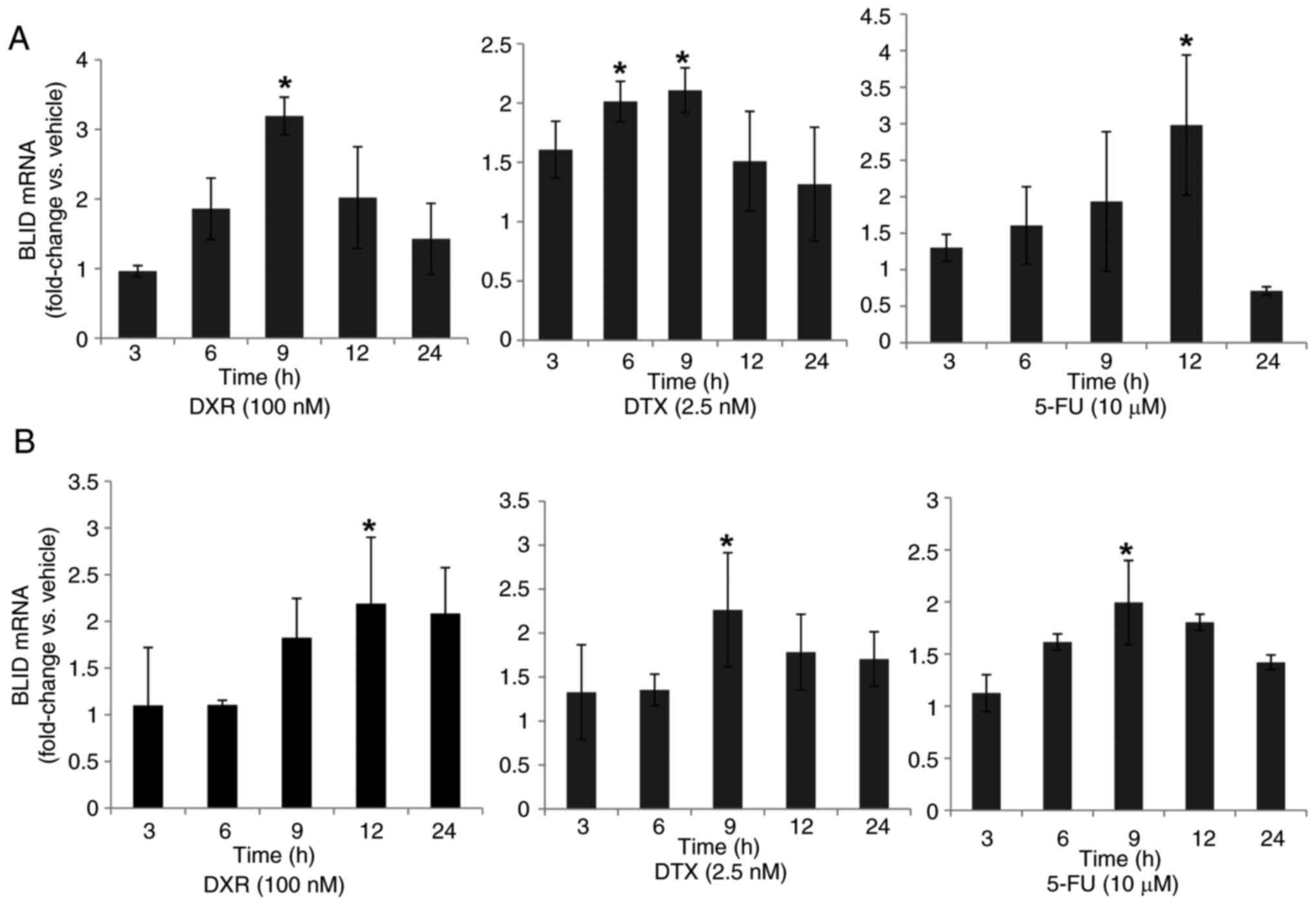 First, the effects of several drugs on endogenous BLID mRNA expression levels in breast cancer cells were assessed. The time-course and dose-response analyses revealed prolonged induction of BLID mRNA expression, albeit to varying extents, in MCF-7 and T47D breast cancer cells treated with DXR, DTX or 5-FU (Figs. 1, S1 and S2). Overall, a 2–3-fold maximal induction of BLID expression was observed with all three drugs in both cell lines. Similar observations were made in MCF-7 cells treated with PTX (Fig. S2). The BLID luciferase reporter activity was also increased 2-6-fold following DXR, PTX, DTX or Cis treatment (Fig. S3, Fig. S4, Fig. S5). Collectively, these results demonstrate that BLID expression was significantly induced in breast cancer cells in response to a wide range of chemotherapeutic drugs (P<0.05).