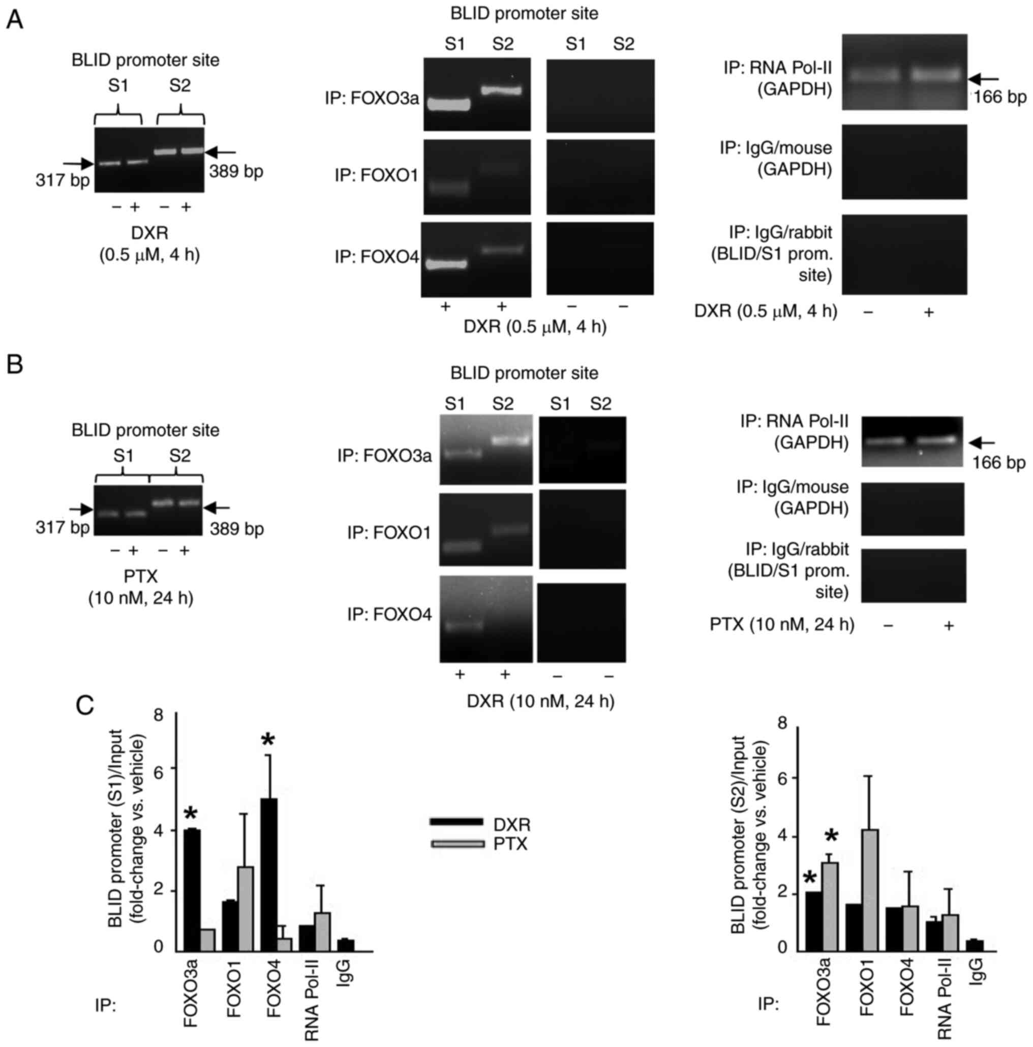 Subconfluent cell cultures were grown in 100-mm plates, and treated with one of the drugs in DMEM supplemented with 5% FBS and 2 mmol/l glutamine. ChIP was performed using an EZ-Magna ChIP kit according to the manufacturer's protocol (cat. no. 17–409, MilliporeSigma). Briefly, cells were cross-linked using 1% formaldehyde for 10 min at 37°C, washed in ice-cold PBS and resuspended in cell lysis buffer containing 1× protease inhibitor cocktail and incubated for 15 min on ice. The cell suspension was spun at 800 × g at 4°C for 5 min, and the pellet was resuspended in nuclear lysis buffer and incubated on ice for 20 min, followed by sonication to obtain 500 bp DNA fragments. Sonication was performed using the Misonix Sonicator 3000 (Misonix) with 15 pulses of 10 sec each at output level 5. This was followed by centrifugation at 10,000 × g at 4°C for 10 min, and the supernatant was used directly for immunoprecipitation with 5 µg of anti-FOXO3a, anti-FOXO4, or anti-FOXO1 antibody overnight at 4°C. A sample of diluted chromatin before immunoprecipitation was taken as a control for input levels. Immune-complexes were incubated with 20 µl of protein G-magna beads for 1 h at 4°C. Subsequently, the beads were washed five times with 1 ml each of the following buffers: Low salt wash buffer (0.1% SDS,1% Triton X-100, 2 mM EDTA, 20 mM Tris-HCl pH 8.1, 150 mM NaCl), high salt wash buffer (0.1% SDS,1% Triton X-100, 2 mM EDTA, 20 mM Tris- HCl pH 8.1, 500 mM NaCl), LiCl wash buffer (0.25 mM LiCl, 1% IGEPAL-CA630, 1% deoxycholic acid, 1 mM EDTA, 10 mM Tris-pH 8.1) and TE buffer. The immune-complexes were eluted with 100 µl of ChIP elution buffer containing 1 µl of proteinase K, and the cross-linking reaction was reversed by incubation at 62°C for 2 h. DNA was purified using spin columns. Using the transcription factor analysis software (MatInspector, Genomatix), several binding sites for FOXO proteins were found in the BLID promoter. Two sets of primers were used to detect the DNA fragments spanning predicted FOXO binding sites (S1 and S2). The BLID primer sequences were as follows: Promoter site S1 (−2128/-2444) forward, 5′-CCAACATGGTAAAACCTTGTCTCT-3′ and reverse, 5′-GGCAAAGACCCAAAGATGTATAAG-3′ and promoter site S2 (−1741/-2129) forward, 5′-CCACCTTGTATGGTGCCTGGTATA-3′ and reverse, 5′-GGGGGATTAATGAGGGAAGGAATA-3′. The ChIP-PCR/qPCR controls included chromatin precipitated with either normal rabbit IgG (S1 and S2 primers, negative control), or mouse IgG and RNA-Pol II antibody (GAPDH primers, positive control; MilliporeSigma). Each PCR reaction was performed with 2 µl of the bound DNA fraction or 1 µl of the input. The PCR conditions were as follows: Preincubation at 95°C for 2 min, followed by 30 cycles of denaturation at 95°C for 30 sec, 30 sec of annealing at 55°C, 30 sec of extension at 68°C, and 5 min of final incubation at 72°C.