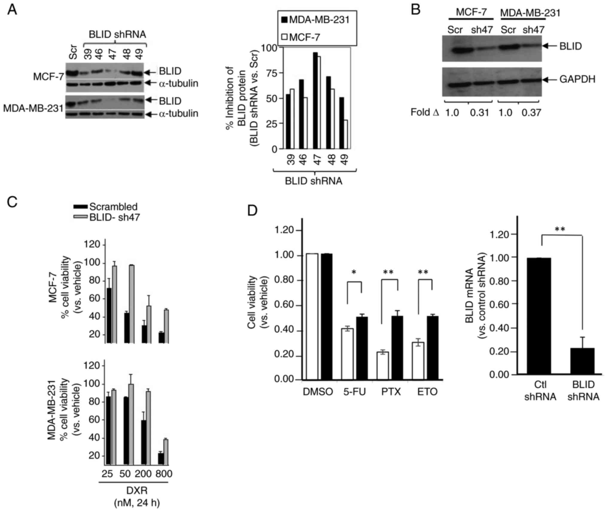 MCF-7 and MDA-MB-231 cells were transfected with one of the five different BLID shRNA lentiviral clones or scramble shRNA (Scr) (pLKO.1-TRC) and BLID knockdown was determined by western blot. As shown in Fig. 3A and B, transfection with BLID shRNA clone 47 (sh47) resulted in ~90% knockdown of BLID expression compared with scramble shRNA in both cell lines. Furthermore, BLID knockdown resulted in increased cell viability in cells treated with DXR in a dose-dependent manner in both cell lines (Fig. 3C). Similar observations were made in BLID knockdown MCF-7 cells exposed to 5-FU, PTX or ETO (Fig. 3D).