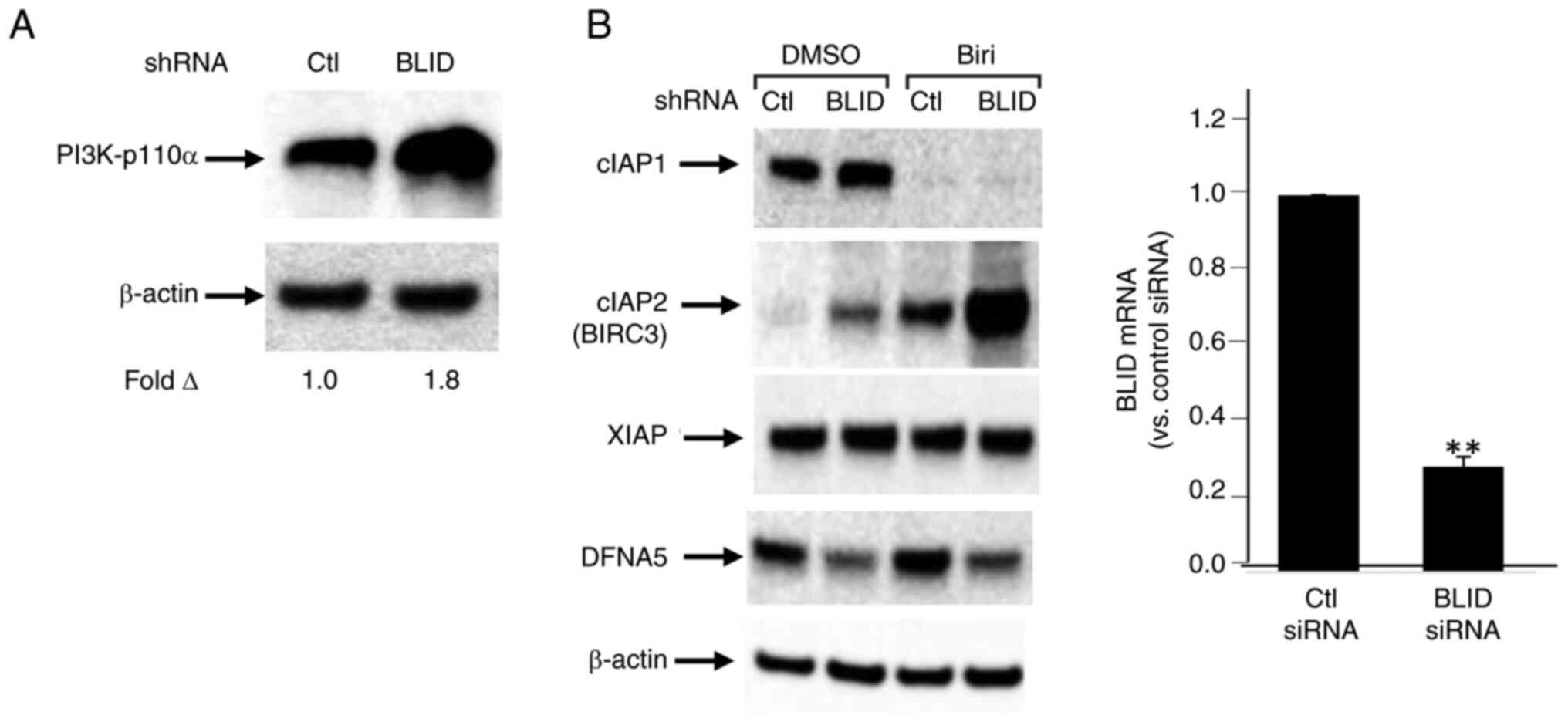 A subset of 13 effectors, shown in Tables I and II, was selected for further validation. The upregulation of cIAP2/BIRC3, PIK3CA/p110α, CSF1, AKR1C3, IFNB1/IFNβ1, IFIT2, IFIT3 and XAF1, and downregulation of DFNA5/GSDME, AKAP12, CHRDL1, TP73 and PRKX was confirmed by RT-qPCR and/or western blotting in one or more breast cancer cell lines (Figs. 4, 5 and S9). Upregulation of cIAP2/BIRC3, initially observed in the RNA array studies of MDA-MB-231 cells (Table I), was verified in these cells by western blotting. Treatment with birinapant, a SMAC-mimetic, reduced cIAP1 expression in both the control and BLID knockdown cells. In contrast, cIAP2/BIRC3 expression was seen in BLID knockdown cells and was increased (>2-fold) in the presence of birinapant (Fig. 5B). Similarly, downregulation of DFNA5/GSDME expression in BLID knockdown MDA-MB-231 cells was validated using RT-qPCR and western blotting (Figs. 4B and 5B). Increased expression of AKR1C3 and PIK3CA/p110α was verified in BLID knockdown models of MCF-7 (Figs. 4 and 5) and LCC9 cell lines (Fig. S9). In addition, the upregulation of IFIT2 and CSF1, and downregulation of AKAP12 and TP73 mRNAs was confirmed in the BLID knockdown MDA-MB-231 and LCC9 cells (Figs. 4B and S9). Interestingly, cIAP2/BIRC3 was also noted as one of the proteins in the STRING-generated BLID protein-protein interaction network (Fig. S10).