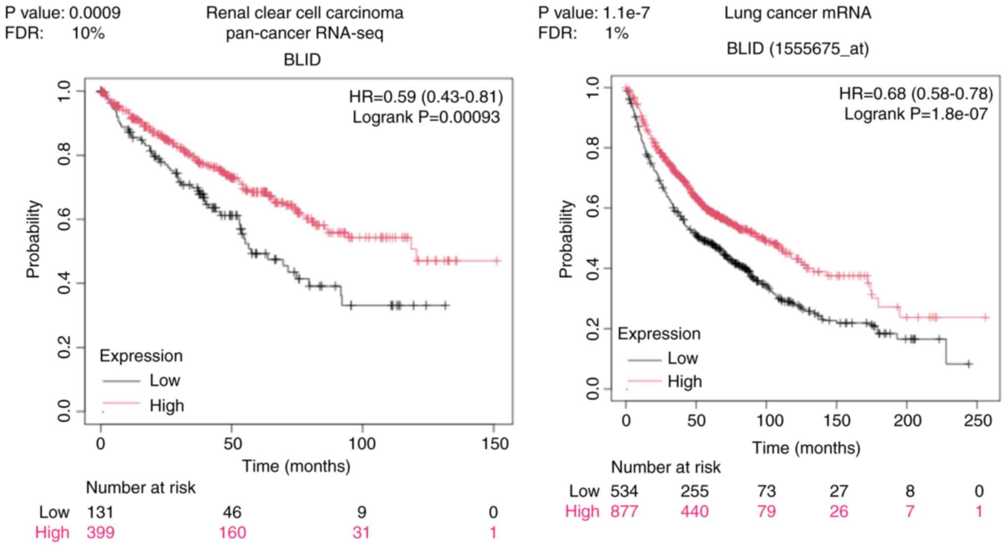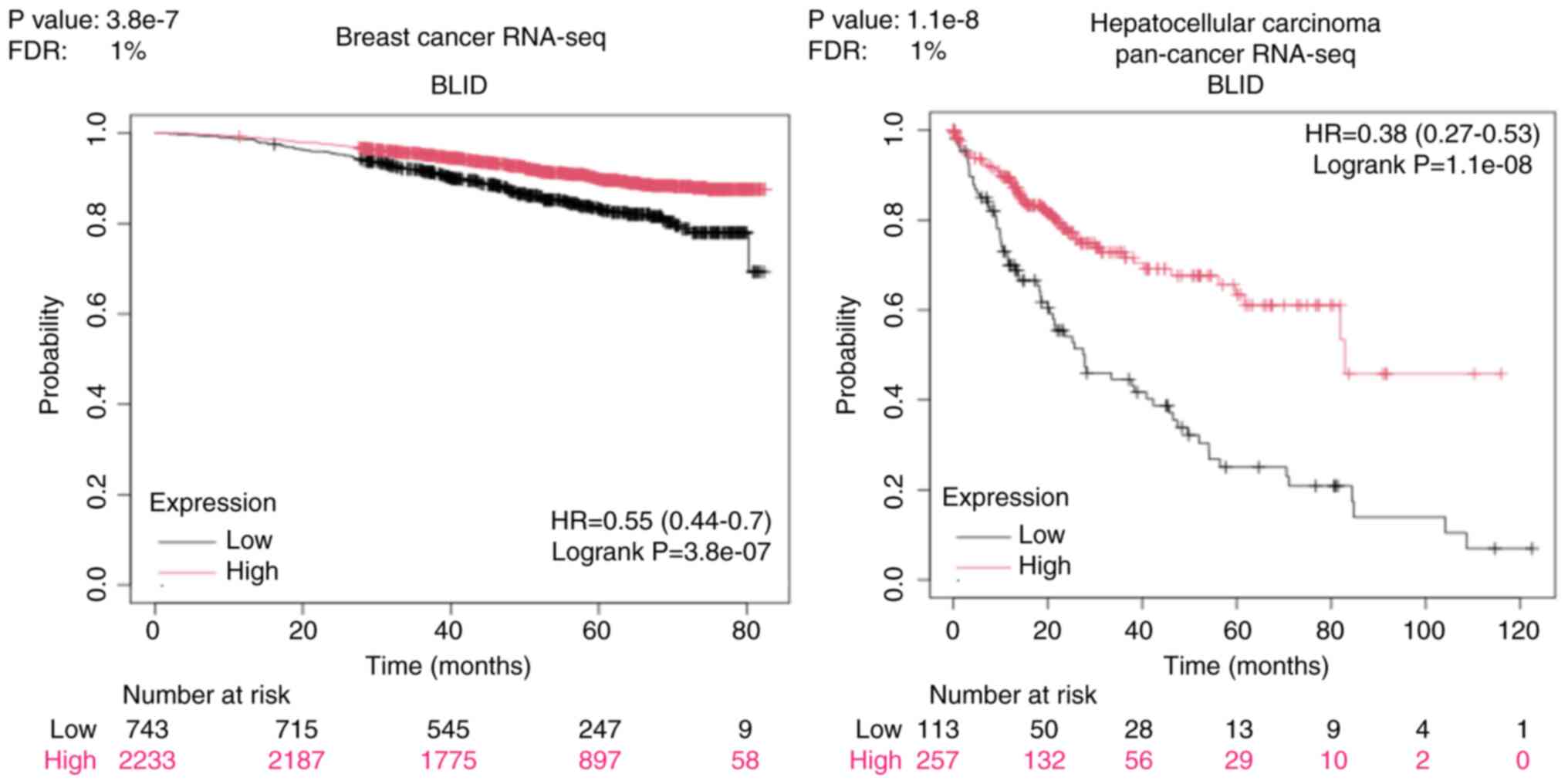 The genome and proteome-wide effects of BLID deficiency observed in multiple breast cancer models, albeit in a cellular context-dependent manner, may have far reaching implications since the publicly available RNA-seq and mRNA datasets show that downregulated expression of BLID is significantly correlated with lower survival probability not only in breast cancer but also in liver, kidney and lung cancers (all P<0.05) (Figs. 6 and 7). The computed median survival was as follows: Breast Cancer, not available; hepatocellular carcinoma, low BLID expression cohort 27.9 months and high BLID expression cohort 82.87 months; renal clear cell carcinoma, low BLID expression cohort 57.47 months and high BLID expression cohort 120.5 months; and lung cancer, low BLID expression cohort 52 months and high BLID expression cohort 95 months. Consistent with the role of BLID in breast cancer cell chemosensitivity, BLID appeared to be a predictive biomarker of breast cancer response to anthracyclines. In this context, BLID gene expression was increased ~1.5 fold in the anthracycline responder cohort (Fig. 8). BLID expression was also indicative of melanoma response to immune checkpoint inhibitor therapy (Fig. S12).