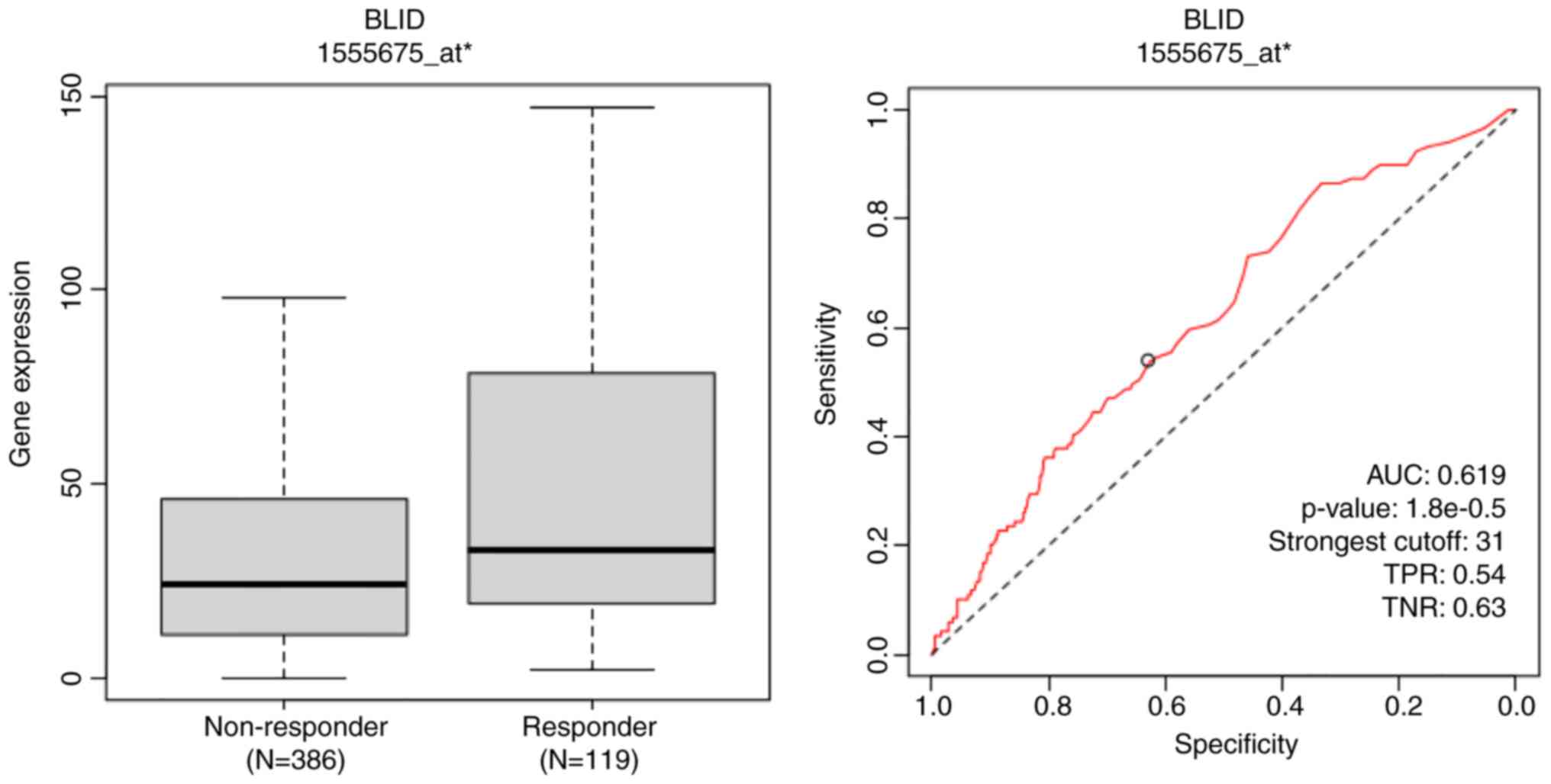 The correlation of BLID expression and treatment response was evaluated based on the ROC curve, calculating the area under the curve (AUC) using the ROC-plotter tool (https://rocplot.com/). The ROC plotter is an online transcriptome-level tool for predicting biomarkers of treatment outcome (32,33). In addition to a P-value and an AUC value, the strongest cutoff is available for best discrimination between responder and non-responder patients. True positive rate (TPR) informs how well a model identifies true positive cases while true negative rate (TNR) shows how well it identifies true negative cases. The JetSet tool was selected to identify the optimal microarray probe set to represent BLID. The BLID gene was entered and ROC analysis was performed to determine the complete pathological response of patients with breast cancer to treatment with anthracyclines. Furthermore, the correlation between BLID expression and melanoma response to any immune checkpoint inhibitor therapy was interrogated.