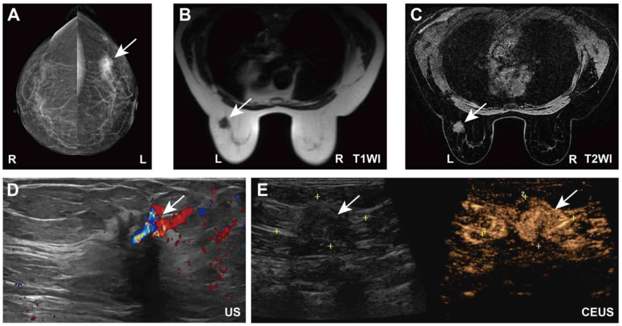 A 54-year-old woman was admitted to The Third People's Hospital of Chengdu (Chengdu, China) in November 2024. The patient had noticed a lump in the left breast >6 months prior to admission, but delayed seeking medical care due to the absence of symptoms such as pain, skin irritation or nipple discharge. Upon admission, a comprehensive physical examination performed by the attending physician revealed a hard, poorly mobile mass measuring ~2 cm in diameter, which was palpated in the upper outer quadrant of the left breast. The mass was mildly adherent to the surrounding tissues. No significant lymphadenopathy was detected in the axilla or supraclavicular region. In addition, routine physical examinations of the cardiovascular, respiratory and abdominal systems revealed no abnormalities. The patient had no notable past medical history. Mammography revealed a high-density, irregularly shaped mass measuring ~35×24 mm with spiculated margins and internal calcifications in the upper outer quadrant of the left breast (Fig. 1A). Moreover, MRI of the breast indicated a mass of ~20×18 mm in the upper outer quadrant of the left breast, with an irregular shape and spiculated margins. The lesion demonstrated low signal intensity on T1-weighted images, along with mixed signals on fat-saturated T2-weighted images and notable enhancement on contrast-enhanced images (Fig. 1B and C). Additionally, color Doppler breast ultrasound demonstrated a hypoechoic nodule measuring ~20×14 mm at the 2–3 o'clock position of the left breast and 4 cm from the papilla (Fig. 1D). After contrast injection, the lesion, measuring 35×17 mm in size, exhibited uneven high enhancement and prominent vascular structures (Fig. 1E). A core needle biopsy indicated invasive breast cancer in the left breast (Fig. S1A and B). Immunohistochemistry (IHC) results revealed that the biopsy sample cells were positive (30%) for Ki-67 (exceeding the 14% threshold), strongly positive (90%) for estrogen receptor (ER), moderately-to-strongly positive (30%) for progesterone receptor (PR) and negative (1+) for human epidermal growth factor receptor 2 (HER2) (Fig. S1C-F). The interpretation of the IHC results was based on the 2024 Guidelines of the Chinese Society of Clinical Oncology (CSCO) for Breast Cancer (7). Specifically, ER and PR were considered positive if ≥1% of tumor cell nuclei showed staining; HER2 expression was interpreted according to standard scoring criteria, with 0–1+ regarded as negative, 2+ as equivocal (requiring fluorescence in situ hybridization confirmation) and 3+ as positive; and Ki-67 was considered high if the proliferation index was ≥14%. Additional preoperative examinations, including chest and abdominal computed tomography (CT), cranial CT and a whole-body bone scan, demonstrated no evidence of distant metastasis or abnormalities. Serum tumor marker levels were also assessed and demonstrated to be within normal ranges: Carcinoembryonic antigen (CEA) was 2.64 ng/ml (reference value, <4.7 ng/ml) and cancer antigen 15-3 (CA15-3) was 18.9 U/ml (reference value, <26.2 U/ml). The initial diagnosis was left-sided breast cancer (luminal B type, cT2N0M0, stage IIA) (7,8). The tumor measured >2 cm in diameter, with no clinically evident axillary lymph node involvement and no signs of distant metastasis, consistent with a clinical stage of IIA (cT2N0M0) (8). According to these findings, as well as the results of the immunohistochemical analysis, the tumor was classified as the luminal B molecular subtype (7).