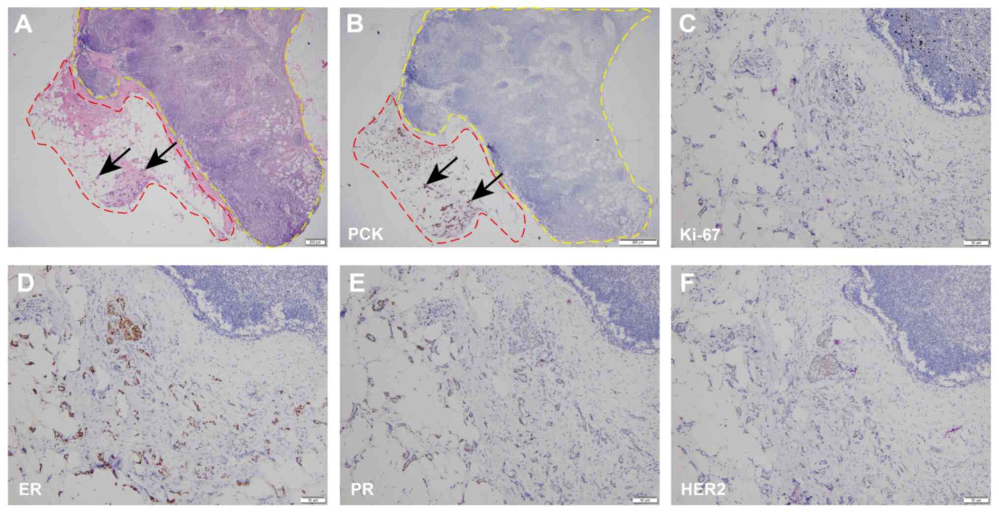In December 2024, the patient underwent a left axillary sentinel lymph node biopsy and left breast quadrant resection under general anesthesia. During surgery, sentinel lymph nodes and adjacent fatty tissue were excised and sent for intraoperative pathological analysis. Frozen sections, rather than fresh tissue, were used in accordance with standard intraoperative diagnostic protocols to enable rapid evaluation. Analysis of the frozen sections identified four sentinel lymph nodes from the left axilla, all of which were cancer-free. The left breast mass was subsequently excised and frozen section analysis was performed. The specimen was rapidly frozen using a cryostat, sectioned at 5–10 µm thickness, stained with hematoxylin and eosin (H&E), and immediately evaluated under a light microscope by a pathologist. The analysis confirmed invasive cancer. Tumor margins, consisting of the inner, outer, superior, inferior, basal and skin flap, were determined to be cancer-free. The surgical procedure was completed without complications and the patient had an uneventful recovery. Postoperative pathological analysis of the excised breast tissue confirmed invasive breast cancer (Fig. 2A and B). The histological grading of breast tumors was performed according to the Nottingham histological score system (9), which evaluates three morphological features: Tubule formation, nuclear pleomorphism and mitotic count. Each component is scored from 1–3, and the total score determines the grade as follows: Grade I/G1 (well-differentiated; score 3–5) in which tumors closely resemble normal breast tissue, are less proliferative and generally indicate a favorable prognosis; grade II/G2 (moderately differentiated; score 6–7), in which tumors exhibit intermediate levels of differentiation and prognosis; and grade III/G3 (poorly differentiated; score 8–9), in which tumors show marked atypia, high mitotic activity and aggressive clinical behavior with a worse prognosis. The cancer focus was classified as Nottingham grade II/G2 (total score 6). Postoperative pathological examination confirmed that the tumor measured 35×26×15 mm in size, based on gross inspection of the resected breast-conserving specimen (data not shown). Histological analysis further demonstrated the presence of neural invasion (Fig. S2A). IHC staining for CD34, a specific marker of vascular endothelial cells, was negative, further confirming the absence of lymphatic or vascular infiltration (Fig. S2B). Additionally, all surgical margins, including the 12, 3, 6 and 9 o'clock orientations and the deep (basal) and superficial (skin) margins, were negative for tumor involvement (Fig. S2C-H). These findings supported the completeness of the resection and the absence of microscopic residual disease. The IHC results demonstrated that the cells from the excised left breast tissue were positive (~30% in hot spots) for Ki-67, strongly positive (90%) for ER, moderately positive (30%) for PR and negative (1+) for HER2 (Fig. 2C-F). These results were interpreted according to the CSCO 2024 guidelines. Furthermore, pathological examination of the left axillary sentinel lymph nodes revealed four nodes with no evidence of metastasis. However, invasive ductal carcinoma was detected in the fatty tissue adjacent to one of the lymph nodes (Figs. 3A and S3). IHC analysis of the axillary sentinel lymph nodes and fatty tissue revealed positive staining for pan-cytokeratin in the fatty tissue, while no expression was observed in the lymph nodes (Fig. 3B). This finding confirmed tumor invasion into the axillary fat tissue rather than the lymph nodes. The tumor focus was classified as Nottingham grade I/G1 (9) (total score 5), with a size of ~3.3×1.9 mm. IHC showed that the fatty tissue cells were positive (5%) for Ki-67, strongly positive (90%) for ER, moderately positive (30%) for PR, and negative (1+) for HER2 (Fig. 3C-F). These IHC interpretations were also determined using CSCO 2024 criteria. Based on all the aforementioned findings, the postoperative diagnosis of the patient was a malignant tumor of the left breast (breast cancer, luminal B type, pT2N0Mx, stage IIA) and a secondary malignant tumor of the left axillary fat tissue (luminal A type) (7).