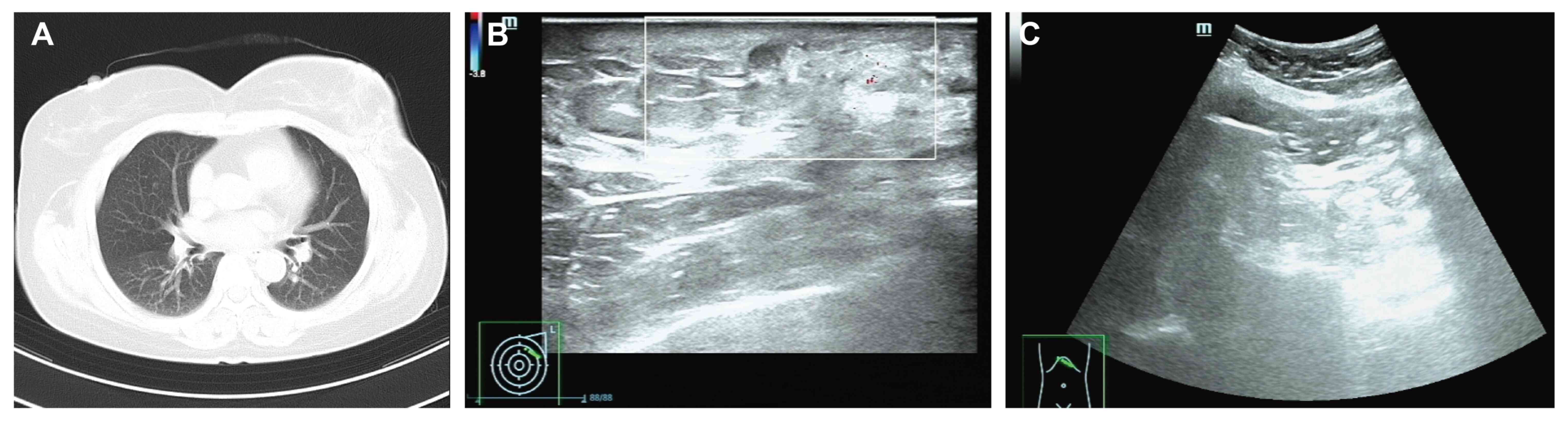 Follow-up evaluations, including chest CT, breast and abdominal ultrasonography, and serum tumor marker assessments, have revealed no evidence of recurrence or metastasis as of May 2025. The most recent tumor marker levels were within the normal ranges as follows: CEA, 3.05 ng/ml (reference value, <4.7 ng/ml); and CA15-3, 19.6 U/ml (reference value, <26.2 U/ml). Radiological follow-up imaging in May 2025 also revealed no abnormal findings: Chest CT revealed no evidence of pulmonary or mediastinal metastasis (Fig. 4A), breast ultrasonography demonstrated postoperative changes in the left breast without signs of local recurrence (Fig. 4B) and abdominal ultrasonography was unremarkable, with no hepatic or peritoneal lesions identified (Fig. 4C). Furthermore, based on the 2024 CSCO Guidelines for Breast Cancer, the patient was recommended to continue AI-based endocrine therapy for 5 years. In addition, a structured follow-up surveillance plan was established, consisting of breast ultrasound every 3 months, and breast MRI and tumor marker evaluations every 6 months. This surveillance strategy aims to enable early detection of locoregional recurrence or distant metastasis, particularly given the unusual site of adipose tissue metastasis observed in the present case. Regular imaging and laboratory assessments are crucial for timely intervention and to improve long-term outcomes in patients with hormone receptor-positive breast cancer (7).