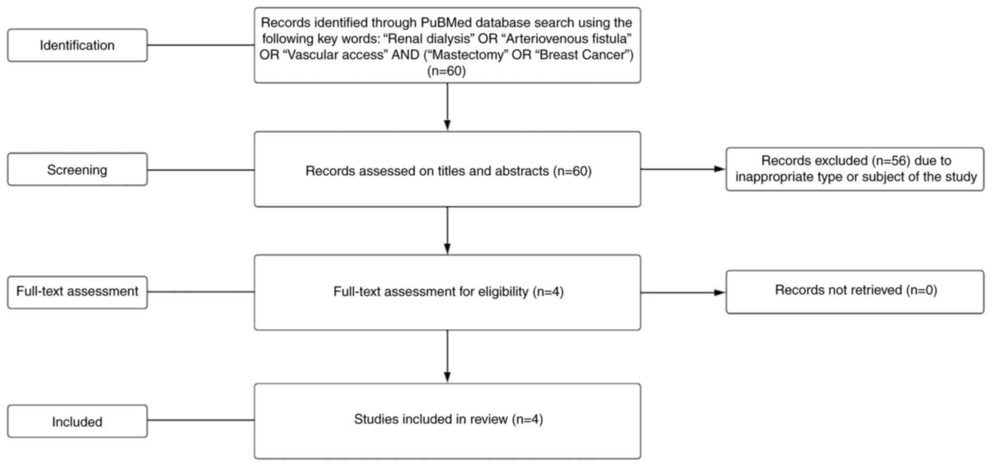 The present systematic review was based on a search of PubMed (https://pubmed.ncbi.nlm.nih.gov/) performed in November 2024, using the following search algorithm: [‘Kidney dialysis’ OR ‘Arteriovenous fistula’ OR ‘Vascular access’ AND (‘Mastectomy’ OR ‘Breast Cancer’)]. Initially, 60 records were obtained and screened for the content of the abstract. Reviews, systemic reviews, meta-analyses and case reports not associated with the topic were excluded. Finally, four papers were included in the present review (Fig. 2) (15–18). Each study was reviewed to assess patient age, AVF location, LE occurrence and the time of AVF creation relative to the mastectomy. Additionally, use of the AVF, including its active or inactive status and the duration of use, was evaluated.