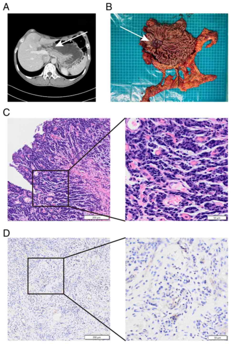 The patient came to Shandong Provincial Hospital (Jinan, China) for further diagnosis and treatment 2 days later. After admission, gastroscopy, lower abdominal enhanced CT and blood tumor marker detection were completed, the enhanced abdominal CT (November 2022) suggested the following: i) There was slight thickening and abnormal enhancement of the gastric wall in the gastric sinus (Fig. 1B). This finding was consistent with the CT findings of cancer (considered T2 stage), which suggested a tumour; and ii) there were no obvious abnormalities in the chest or lower abdomen.