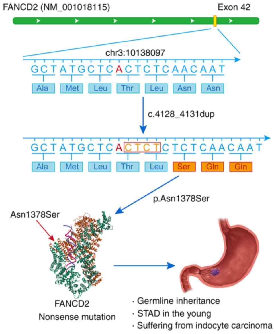Subsequently, 9 days later, after important organ dysfunction, extensive abdominal adhesions, coagulation dysfunction, and cardiovascular and cerebrovascular disease were excluded, laparoscopic radical gastrectomy for gastric cancer (distal gastrectomy plus gastrojejunal anastomosis plus Braun anastomosis plus D2 lymph node dissection) was performed under general anaesthesia (November 2022). During the operation, limited thickening of the gastric wall was observed in the gastric sinus without reaching the periphery. There were no enlarged lymph nodes in the perigastric area. The patient was followed up via outpatient visits every half year and the last follow-up was in May 2024. Postoperative pathology with staining performed following our team's established protocol (6) revealed ulcerative poorly differentiated adenocarcinoma (lateral to the lesser curvature of the gastric antrum), Lauren type: Diffuse type. The area was 2.5×2.5 cm and the cut area 2.5×0.5 cm (Fig. 1C). The lesion invaded the deep muscular layer, with focal involvement of nerves and no clear intravascular tumour thrombus was observed. No cancer was detected in ‘upper tangent’, ‘lower tangent’ or lymph node dissection groups. Based on the 8th gastric cancer guidelines formulated with reference to the National Comprehensive Cancer Network (NCCN) Clinical Practice Guidelines in Oncology, the postoperative pathological stage was pT2N0Mx (https://www.nccnchina.org.cn/guide/index) (7). After obtaining informed consent from the patient, the tissue samples obtained during surgery were sent for genetic examination. Using adjacent non-cancerous tissue as the control sample, DNA was extracted using an AllPrep DNA Mini Kit (cat. no. 80204; Qiagen GmbH) and Sure Select Human All Exon V6 (cat. no. 5190-8863; Aligent Technologies, Inc.) according to the manufacturer's instructions from both the adjacent non-cancerous tissue and the surgically resected tumour tissue. The Agilent 2100 Bioanalyzer (Agilent, Technologies, Inc.) was used for DNA quality check, and libraries were loaded at 20 pM and measured with an Invitrogen Qubit (Thermo Fisher Scientific, Inc.) for sequencing. The extracted DNA underwent paired-end sequencing using NovaSeq 6000 SP reagent kit (cat. no. 2002746; Illumina, Inc.) and whole-exome sequencing technology on the NovaSeq 6000 platform (Illumina, Inc.) with a read length of 250bp, which covered all exonic regions of the genes, as well as partial intronic and promoter regions. The obtained FASTQ sequencing data were quality controlled and cleaned via Trimmomatic 0.39 (http://www.usadellab.org/cms/?page=trimmomatic) before being mapped to the hg19 human reference genome using BWA 0.7.17-r1188 (https://bio-bwa.sourceforge.net/). GATK 4.3.0.0 (https://gatk.broadinstitute.org/hc/en-us) was employed to identify all possible variations, including single-nucleotide variants, small and large insertions and deletions in DNA, amplifications and deletions of gene copy numbers, as well as gene fusions and rearrangements, among other forms of genetic variations. By comparing the differences between the tumour tissue and the control sample, mutations exclusive to the tumour cells were considered somatic mutations, while those also present in the control sample were regarded as germline mutations. The genetic testing results demonstrated that all exons of 65 genes contained 1 heritable embryogenic pathogenic variant, namely the Insertion and Deletion (InDel) of exon 42 of FANCD2. Specifically, codon 1,378 of the FANCD2 gene, asparagine, is changed to serine and is terminally encoded at codon 5 of a new reading frame, notated as FANCD2 N1378Sfs*5 variant. It has been predicted that the N1378Sfs*5 variant may cause nonsense mutation-mediated mRNA degradation process of FANCD2 in cells, which may result in a functional deletion of the FANCD2 gene (Fig. 2). For immunohistochemical staining for FANCD2 that was subsequently performed on the postoperative tumour tissue sections of the patient, formalin (10%) was applied as the fixative at room temperature for 24 h, followed by embedding in paraffin wax. The sections were cut to a thickness of 5 µm. For permeabilization, 0.3% Triton X-100 was applied for 10 min at room temperature. The blocking was performed with 5% normal goat serum (cat. no. ZLI-9021; ZSGB-BIO) for 30 min at room temperature. The primary antibody used was FANCD2 (cat. no. ab108928; Abcam), diluted at 1:50, and incubated at 4°C overnight. The secondary antibody was from the goat enhanced polymer detection system (cat. no. PV-9003; ZSGB-BIO) used according to the manufacturer's instructions, which includes a polymer horseradish peroxidase and 3,3′-diaminobenzidine substrate for color development. The secondary antibody was incubated at room temperature for 30 min. Light microscopy was used for imaging. Immunohistochemical staining confirmed that the FANCD2 in the patient was a nonsense mutation, which resulted in reduced FANCD2 protein expression levels (Fig. 1D).
