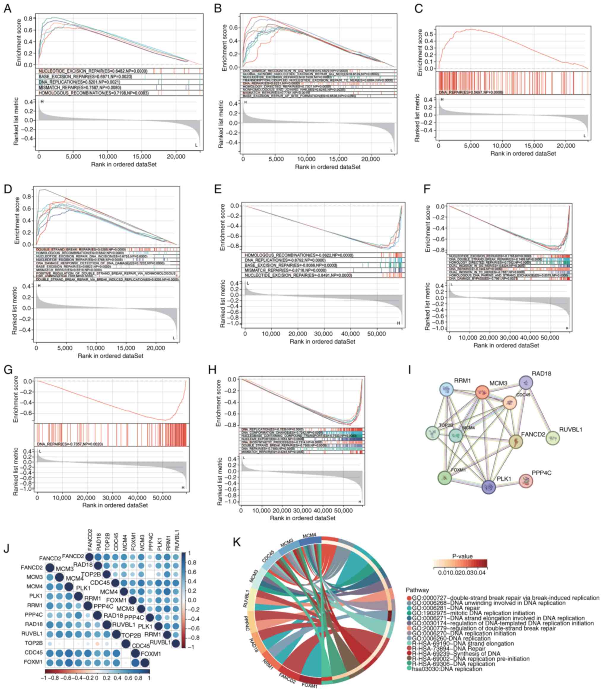 By obtaining the Asian Cancer Research Group cohort from the GEO database, 300 patients with gastric cancer and TCGA-stomach adenocarcinoma (STAD) cohort sequencing data from 410 patients with gastric cancer were collected to analyse the function of FANCD2 using bioinformatics methods (8). The analysis demonstrated that utilizing the Kyoto Encyclopedia of Genes and Genomes database, Hallmark Gene Sets and Gene Ontology-Biological Process as annotation backgrounds effectively annotated DNA repair-related signaling pathways, such as ‘DNA replication’ (9) and ‘mismatch repair’ (10) (Fig. 3A), ‘DNA repair’ and ‘DNA damage recognition in Global Genome Nucleotide Excision Repair’ (11,12) (Fig. 3B and C) and ‘DNA-damage-response detection-of-DNA-damage’ (10,12,13) (Fig. 3D). These results were well validated in the TCGA-STAD dataset (Fig. 3E-H). Furthermore, the enriched markers of DNA repair related signalling pathways were extracted and merged, which resulted in a total of 1,107 DNA repair-related genes and the top 10 key genes (Fig. 3I). Correlation analysis between the top 10 key DNA repair genes and FANCD2 indicated a strong positive correlation (P<0.05), particularly with cell division cycle 45, radiation sensitive protein (RAD)18, ribonucleotide reductase catalytic subunit M1 and minichromosome maintenance complex component 4 (Fig. 3J). Functional enrichment analysis of the top 10 key DNA repair genes and FANCD2 demonstrated that these 11 genes were well annotated in numerous DNA damage repair signalling pathways, among which FANCD2 interacted with RAD18, protein phosphatase 4 catalytic subunit and RuvB-like 1 in an interlocking manner in the R-HSA 73894-DNA repair pathway (Fig. 3K).