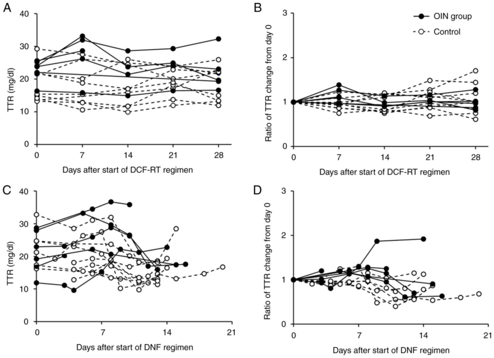 The actual values and change rates of TTR from the start of chemotherapy or chemoradiotherapy are summarized in Fig. 1. Although there was considerable inter-individual variability in TTR at the start of chemotherapy or chemoradiotherapy, no clear difference was observed between the OING and ContG patients. In the OING, TTR tended to decrease during the first 7 days, and the rate of change was significantly greater than that of the ContG (OING vs. ContG, 0.86±0.091 vs. 1.06±0.15; P<0.001). However, by 14 days, the values were similar to those at the start of treatment, with no significant difference in the rate of change (OING vs. ContG, 1.02±0.28 vs. 1.14±0.29; P=0.36).