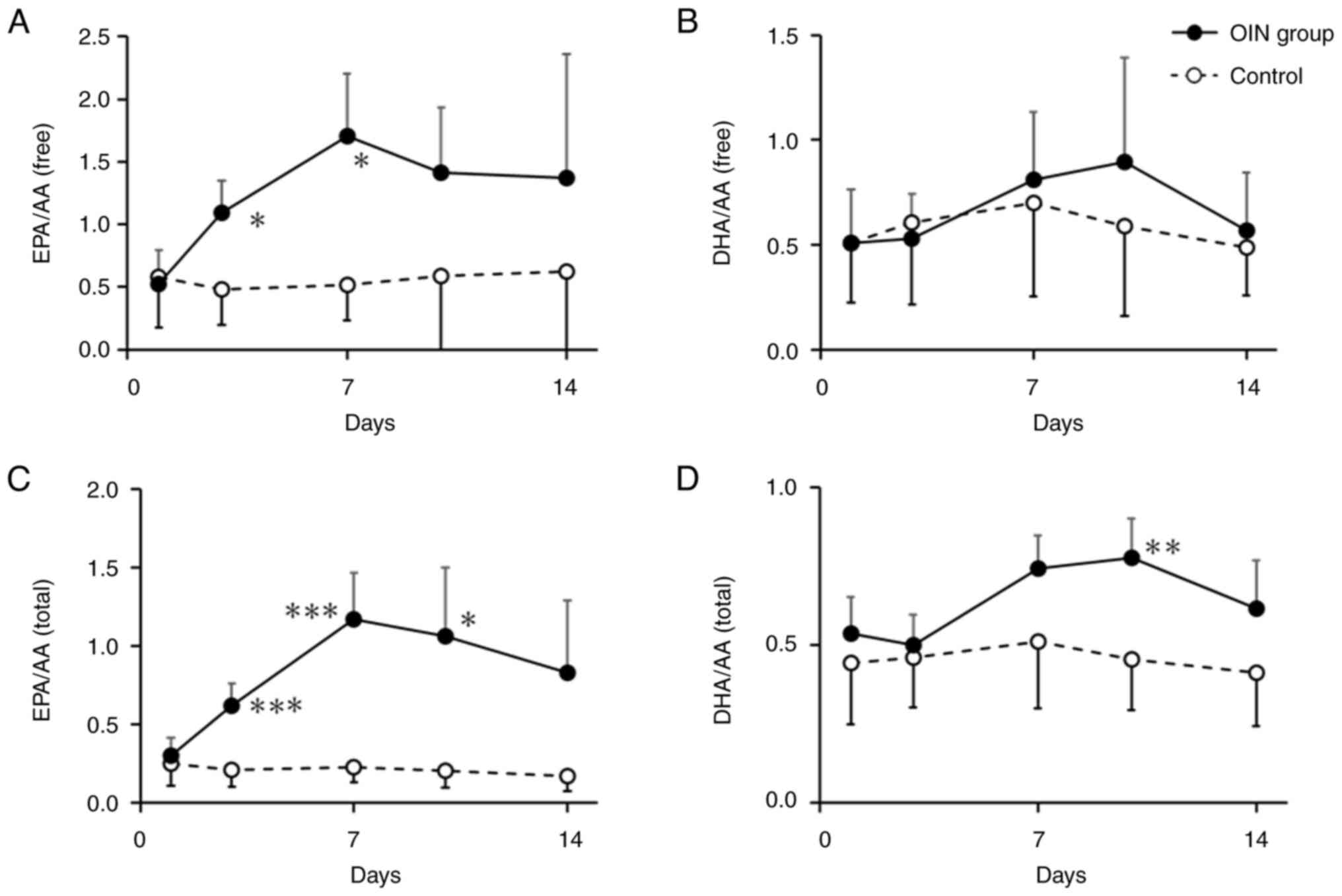 Given the small number of patients included in the analysis, treatment-specific analyses were not performed, and all patients were combined to evaluate the differences in the changes in blood EPA and DHA concentrations between the OING2 and ContG2. No significant differences were observed in baseline evaluation parameters between the OING2 and ContG2. The results of the EPA/AA and DHA/AA ratios for both free and total fatty acids are summarized in Fig. 2. The free EPA/AA ratios on days 3 and 7 were significantly higher in the OING2 than in the ContG2, while no difference was observed in DHA/AA between the two groups. For total fatty acids, the EPA/AA ratios on days 3, 7, and 10 were significantly higher in the OING2 than in the ContG2, showing a sustained elevation over time. In addition, DHA/AA on day 10 was significantly higher in the OING2 than in the ContG2, although no significant difference was observed at earlier time points. Table V summarizes the EPA/AA and DHA/AA ratios for both free and total fatty acids, including both unadjusted P-values and FDR-adjusted q-values.