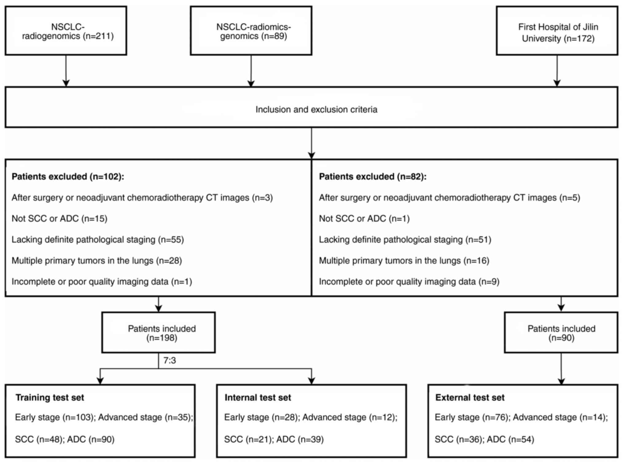 Data from all patients from the NSCLC-Radiogenomics and NSCLC-Radiomics-Genomics datasets were collected and the patients were randomly divided into two groups: 70% for the training set and 30% for the internal test set, including 151 cases of early stage and 47 cases of advanced stage NSCLC, and 69 cases of SCC and 129 cases of ADC. An additional 90 patients from the First Hospital of Jilin University were assigned to the external test set. The recruitment process for these patients is illustrated in Fig. 1.