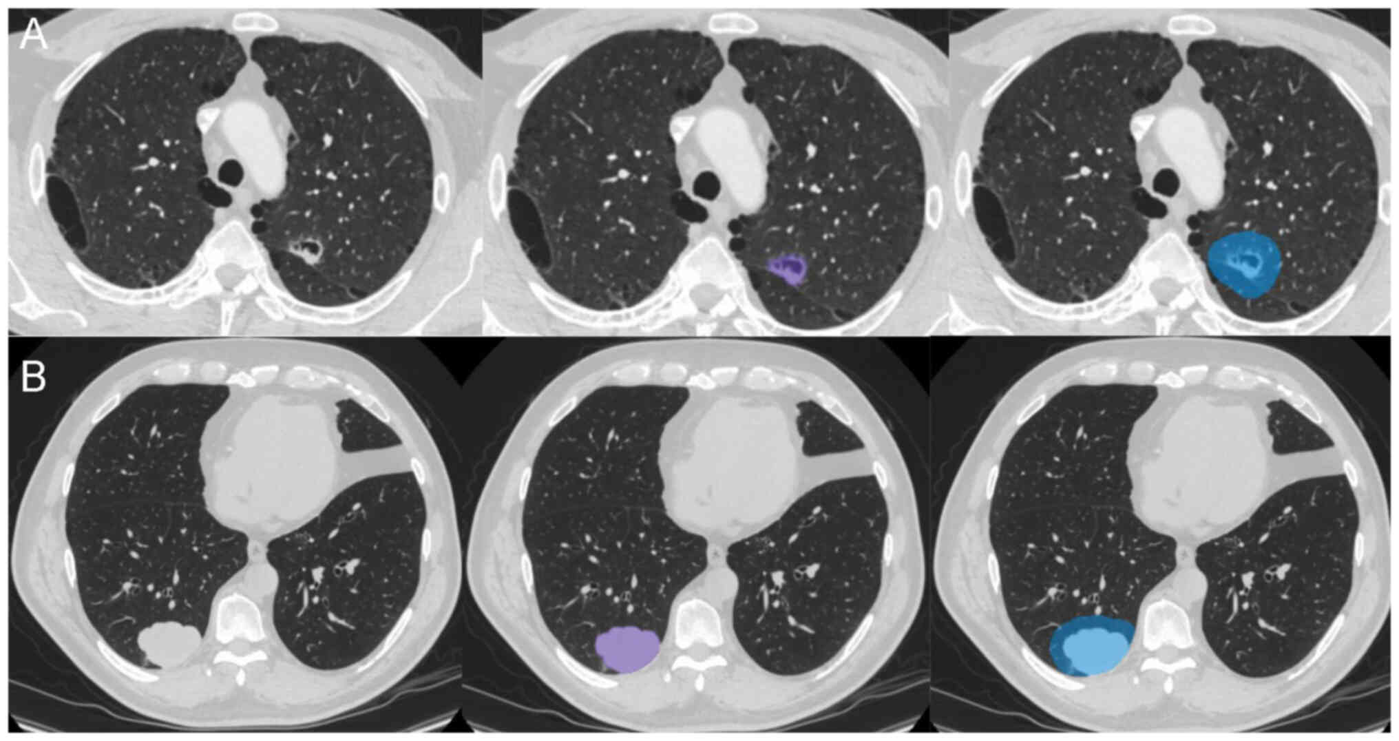 Imaging techniques such as computed tomography (CT), magnetic resonance imaging (MRI) and positron emission tomography (PET)/CT are widely used for tumor screening (11). However, PET/CT is restricted by radiation exposure, high costs and the unavailability of equipment. MRI also has disadvantages concerning longer acquisition times and high costs (12,13). By contrast, CT, with its high resolution and short acquisition time, is utilized in clinical practice worldwide for diagnosis, staging, survival prediction and monitoring treatment response in patients with lung cancer (14–18).
